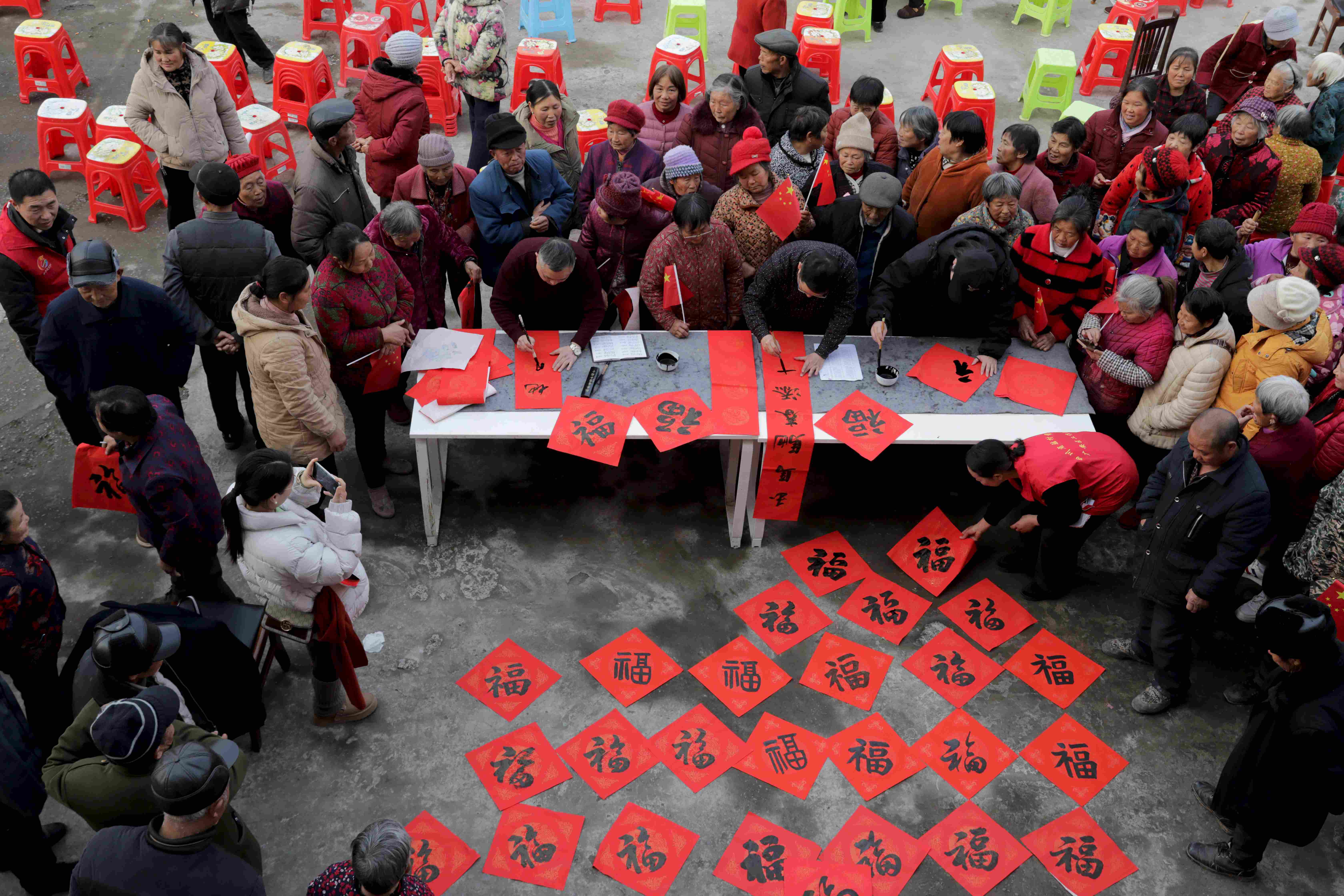 广安区政协诗书画院的书法家和民盟广安区总支部的书法爱好者提笔挥毫为村民写法治春联和福字