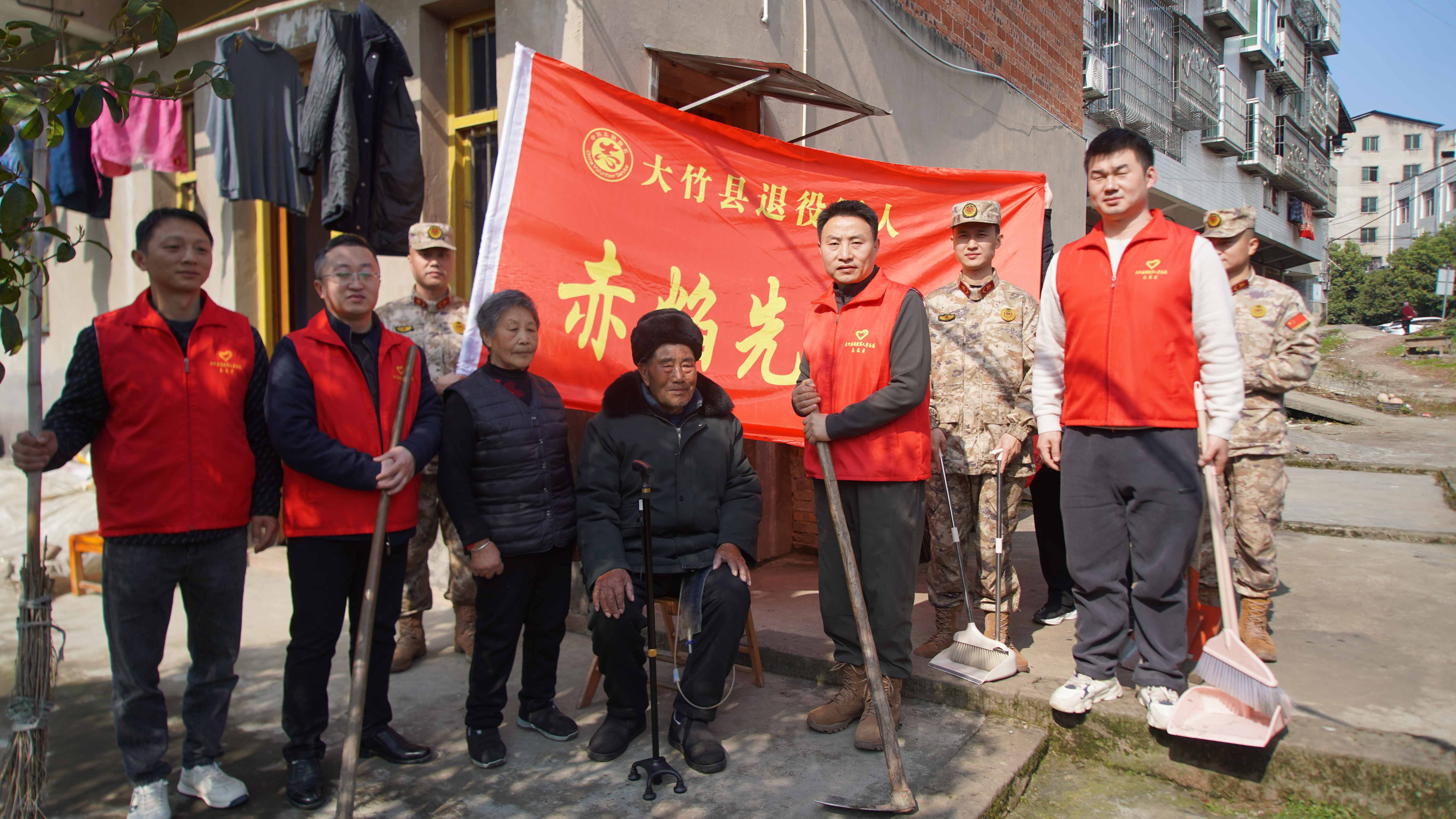 在庙坝镇太平村2组高龄在乡复员军人龚天豪家中,志愿者们重点开展暖心帮扶。现年90岁的龚天豪曾入朝作战,如今小脑萎缩、行动不便,长期留置导尿管,日常起居全靠老伴照料。志愿者们细致清扫室内外卫生、整理床铺衣物、擦拭门窗家具、清除卫生死角,用贴心服务改善老人居住环境,详细询问身体状况与生活困难,把温暖送到老兵心坎上。