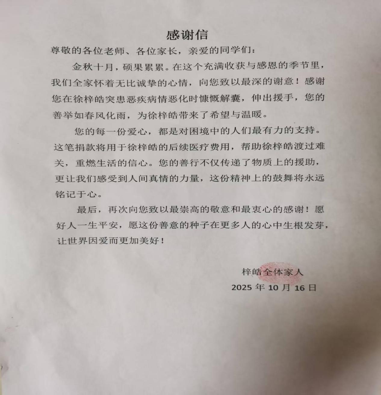 为帮助徐梓皓同学早日战胜病魔、重返熟悉的校园,学校迅速发起以“伸出您温暖的双手,献出您无限的爱意”为主题的爱心捐款倡议,向全体家长、师生发出支援号召。倡议发出,全校积极响应:老师们带头捐献爱心,用行动为学生树立榜样;家长们纷纷伸出援手,哪怕是一笔笔小额捐款,都饱含着对孩子的牵挂与祝福;同学们也拿出自己的零花钱,用稚嫩的行动传递着最纯粹的善意。全部善款统一交由德育处登记汇总,共计36016.2元,全程公开透明,接受全体师生与家长的监督,确保每一分善款都能精准用于徐梓皓同学的治疗。