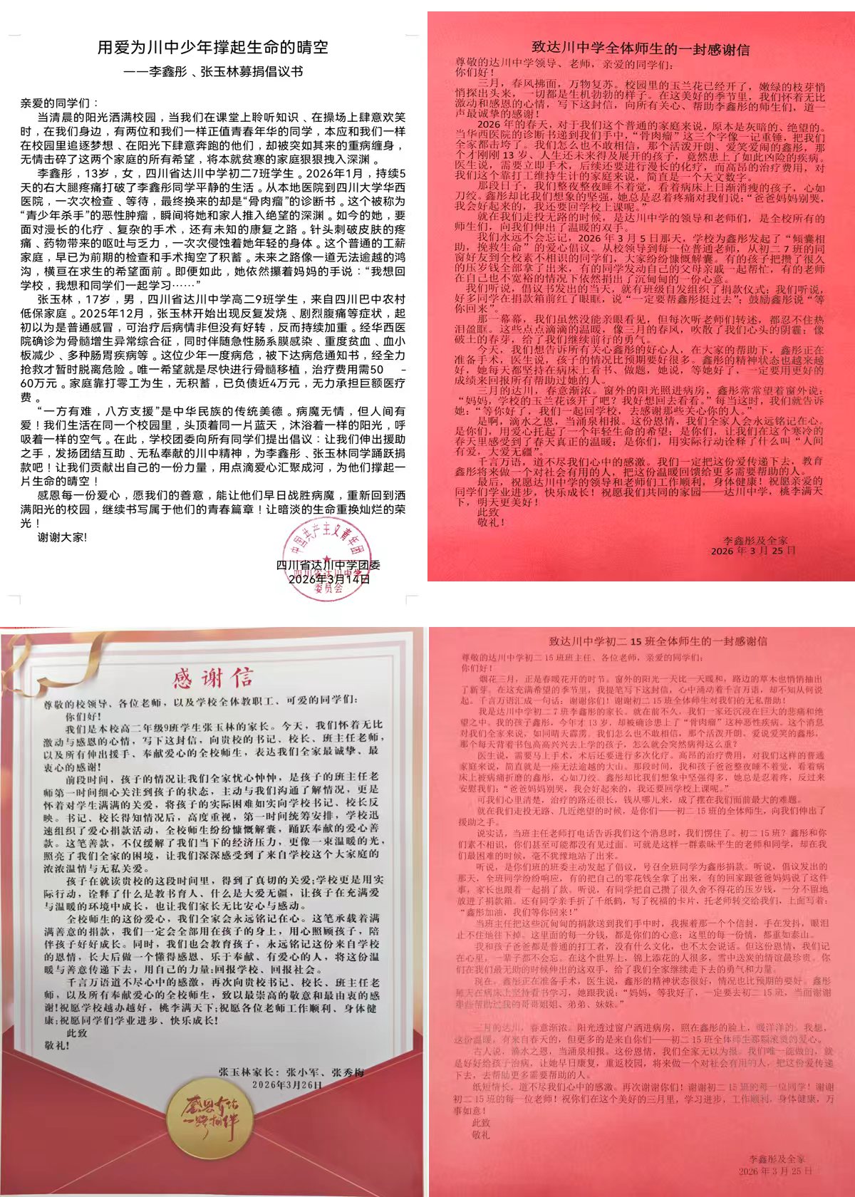 “祝愿李某彤、张某林同学早日战胜病魔,重新回到洒满阳光的校园,继续书写属于他们的青春篇章!让暗淡的生命重焕灿烂的荣光!”这是全校师生共同的心愿,也是这个春天里最温暖的祝福。(四川省达川中学 杨华)