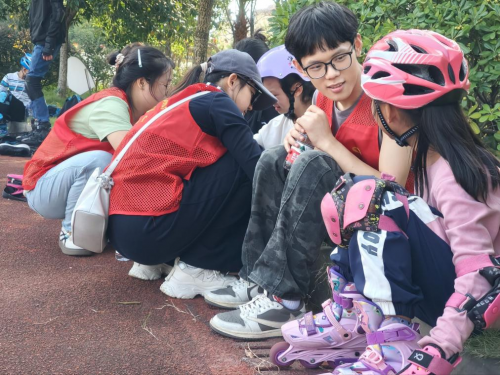 图为志愿者陪伴特殊儿童练习轮滑。王沛颜 供图