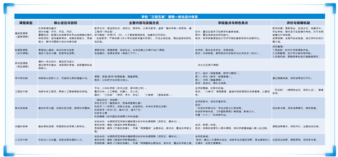 在课程建设方面,学校着力构建“三型五类”课程体系。严格开足开齐基础型国家课程,筑牢学生知识根基;积极推进拓展型校本课程,拓宽育人广度;重点打造研究型课程,并将其细分为学术研究、工程技术、参与体验、共建共享、人文艺术五大类别,有效激发学生的探究兴趣与创新潜能。