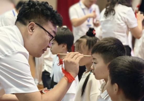 朱砂启智,一点灵光映党晖。“朱砂启智”将活动推向高潮。校领导及老师们用朱砂在孩子们的额头正中点上红痣,寓意开启智慧,并轻声寄语“党晖启智,明礼成才”。一点朱砂,凝聚着师长们美好的祝愿。