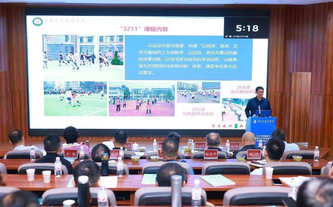 汇报中,陈刚校长围绕学校“文峰·品耀·幸福·成长”课程体系展开,重点介绍“健康生命力提升课程”与“自主学习力激发课程”两大特色课程。在“健康生命力提升课程”建设上,以学生生命质量为核心,从运动时间、内容、强度三个维度科学构建“3211”体育课程体系,以三大球、基础体育训练、羽毛球特色项目、健美操时尚训练丰富运动内容,通过每日分层训练、每周体育比赛、每月达标测试、每年体育比武明确运动标准。八载坚守,学校以体育人,不仅帮助学生养成终身运动习惯、筑牢健康体质根基,更在运动中培养学生责任担当、抗挫能力与家国情怀,让青春活力在校园尽情绽放。