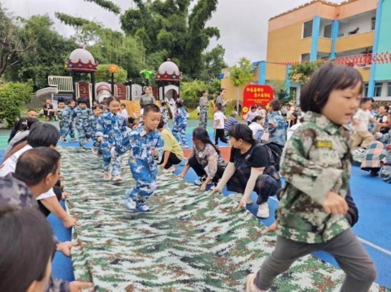 趣味游戏环节亮点纷呈:滑溜布、迷彩网、体操垫、轮胎等道具化身为“沼泽草地”“泸定铁索桥”等红色场景。“亲子过草地”时幼儿手脚并用、在家长协助下艰难“挪行”;“勇闯泸定桥”环节,幼儿在家长充当“桥墩”的布面“桥面”上努力保持平衡奔跑;“渡赤水”“共越大雪山”“同乘小战车”等游戏里,家长与幼儿默契配合、协作闯关,在模拟红色情境的过程中,既体验到坚韧的红色精神,又让亲子陪伴的温情满溢现场。