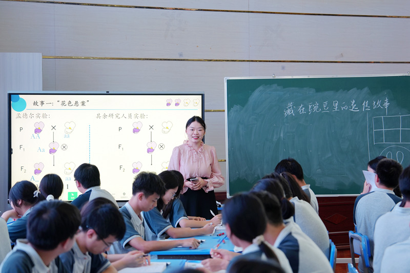 泸州老窖天府中学朱吉平老师以《孟德尔基因自由组合定律的解读——藏在豌豆里的遗传故事》为题开展复习课,结合豌豆基因染色体定位等前沿研究,引导学生进一步理解基因自由组合定律的实质。