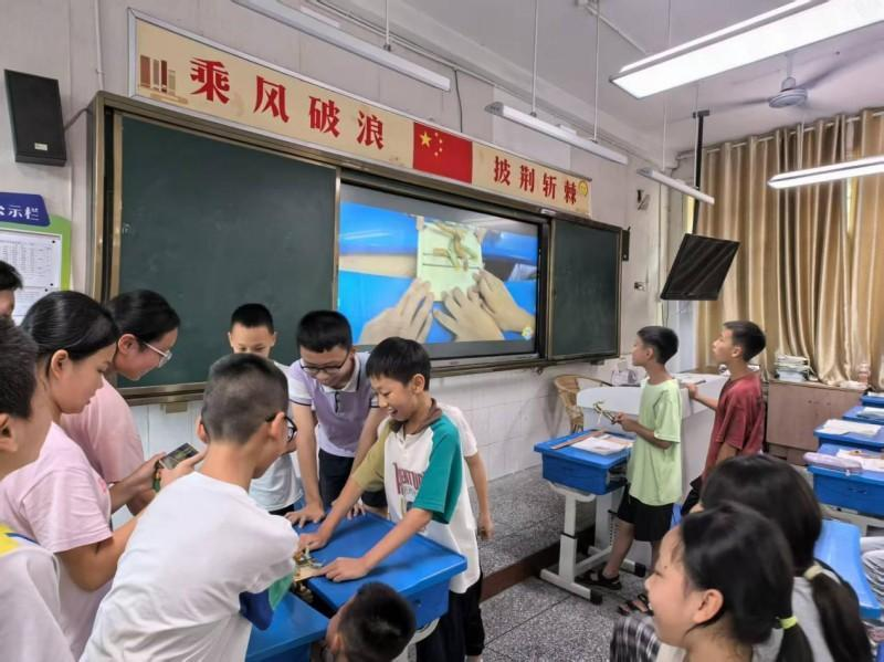 在动手制作环节,同学们化身“小小工匠”。他们用毛笔杆锯成寸许长的小段作为竹节人的脑袋和身躯,再细心钻孔、穿线、装手脚。看似简单的工艺,却需要十足的耐心与细致地操作。随着一个个竹节人诞生,课堂里充满了期待与喜悦。