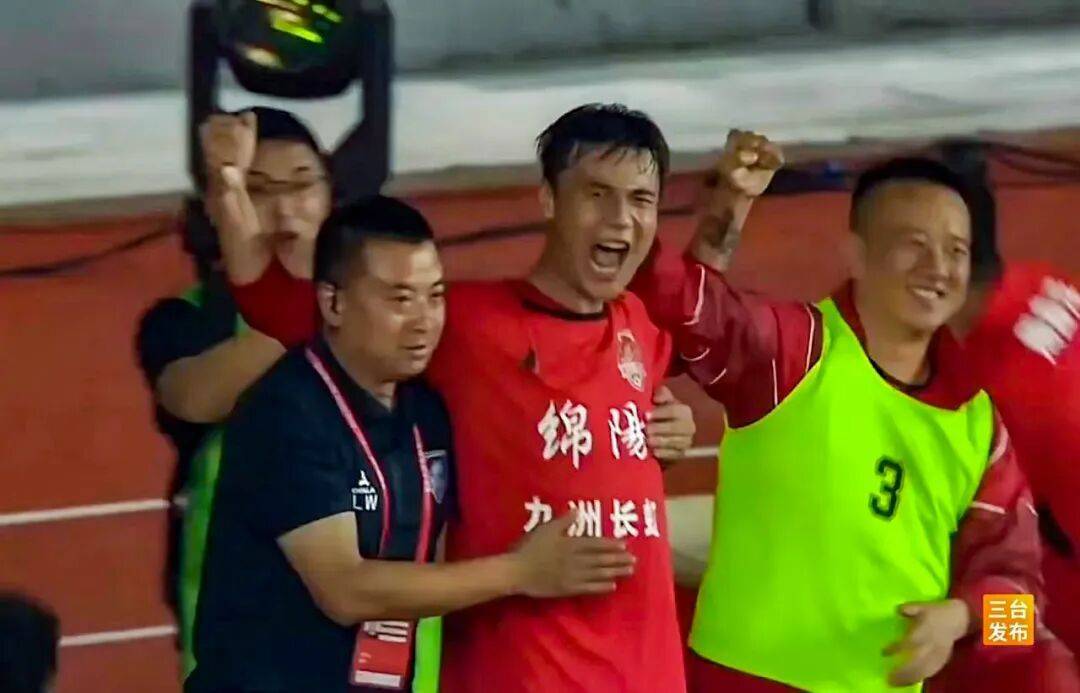 进攻从定位球发起,中路经过三次传接后分到左边路,边路队员把球传到小禁区前。绵阳中学实验学校2021届学子、绵阳队主力前锋戴宇在对方三名防守队员的包夹下,抢在对方队员之前迎着下坠的皮球左脚垫射,球如出膛炮弹直挂死角。1:1!补时绝平!整个客场看台瞬间化作翻涌的红色海啸。