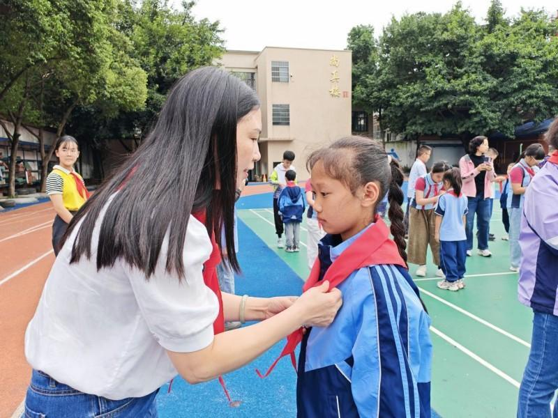 仪式在庄严的《中国少年先锋队队歌》中拉开序幕。鲜艳的队旗迎风飘扬,队员们精神抖擞、肃立敬礼,嘹亮的歌声满含同学们对少先队组织的向往。随后,大队辅导员宣读新队员名单,学校领导和老队员代表为186名新队员佩戴上鲜艳的红领巾。新队员们轻轻抚摸着胸前的红领巾,眼神中充满自豪与激动。