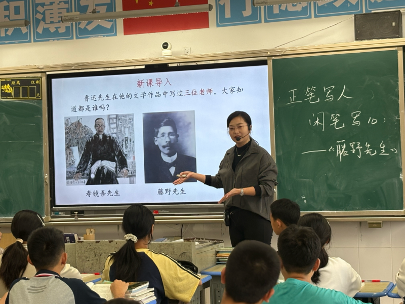 活动当天,宜宾市教科所陈明冲所长带领骨干教师们为江南初级中学带来了四堂精彩的示范课。语文课堂上,周媛老师以“最喜欢的老师”分享导入《藤野先生》的教学。周老师聚焦文本脉络与人物形象,带学生梳理“东京—仙台—北京”的地点变化及对应事件,结合历史背景解析鲁迅赴日动因,剖析藤野先生“添改讲义、纠正解剖图”等细节,提炼其“认真负责、关心学生、不拘小节、生活简朴”的形象。