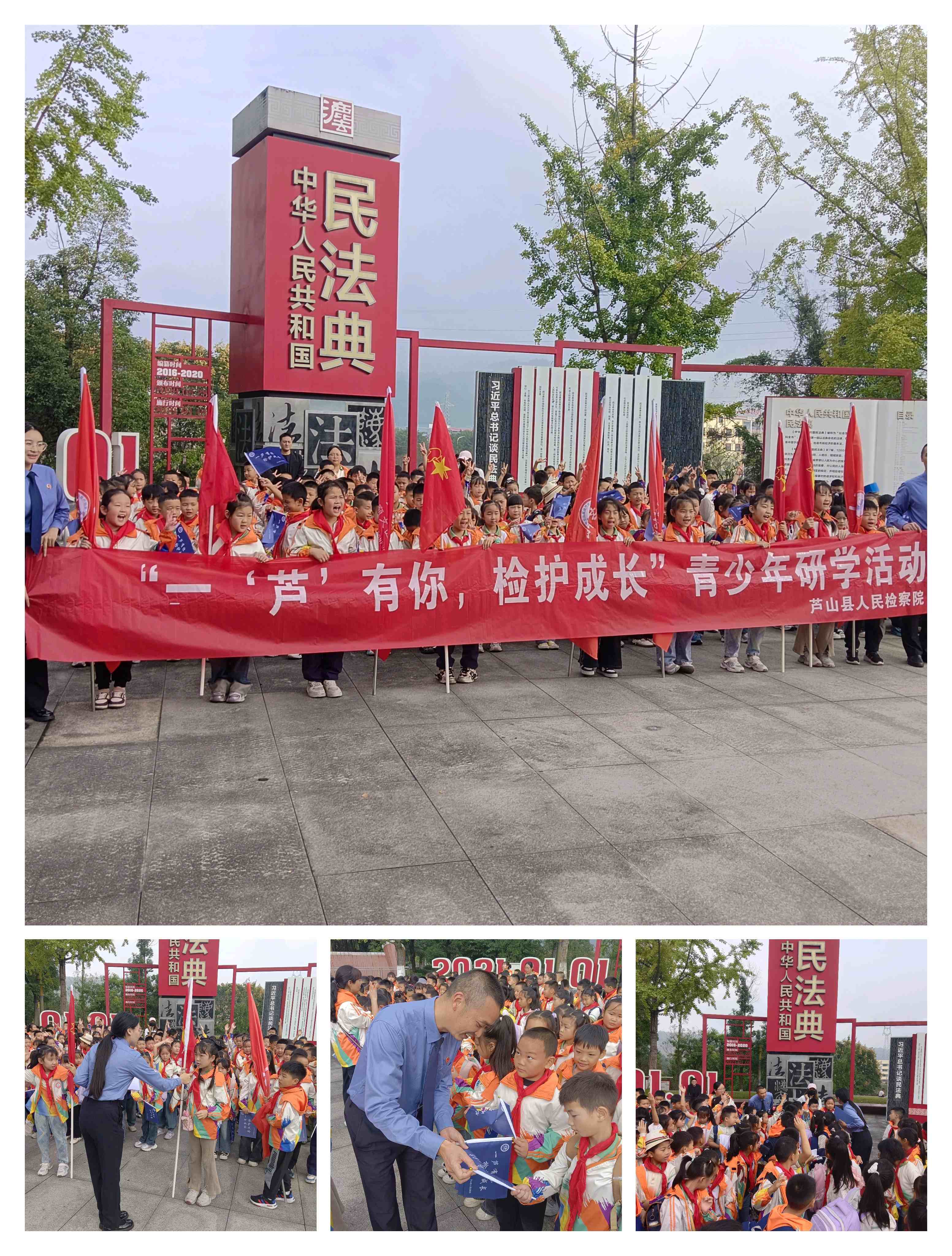 为持续深化未成年人法治教育工作,创新普法形式,10月15日,雅安市芦山县检察院精心策划并成功举办“一‘芦’有你,检护成长”系列法治宣传活动。本次活动打破传统课堂模式,组织芦阳三小共三批次(一、二年级段、三、四年级段、五六年级段)的学生,分别走进龙门红军村、地震纪念馆及金花法治公园,通过一场场“沉浸式”研学之旅,在孩子们心中播撒下法治的种子。