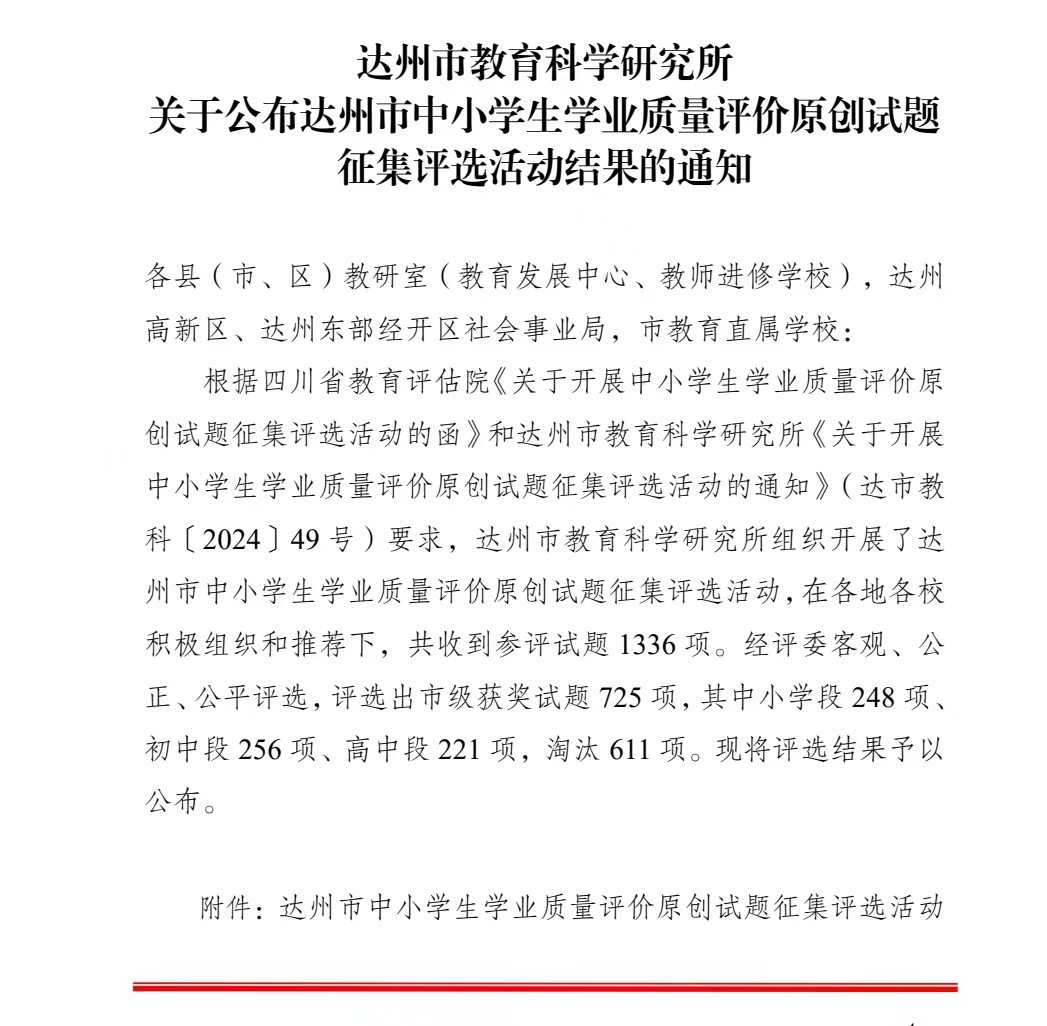川中教师紧跟教育改革方向,聚焦学科核心素养,结合教学实际,设计出一批高质量、有特色的原创试题,充分展现了达川中学教师扎实的专业功底和良好的教学研究能力。他们的优秀成果,不仅为学校赢得了荣誉,也为推动全市中小学教育质量评价体系建设贡献了智慧和力量。