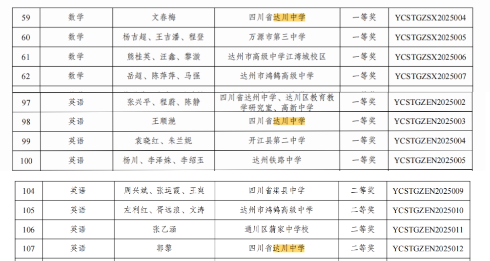 在此,特向获奖教师表示热烈的祝贺!希望老师们继续发扬钻研精神,不断提升教学与科研水平,在今后的各项活动中再创佳绩,为推动学校高质量发展和服务学生全面成长作出更大贡献!(四川省达川中学 杨丹)