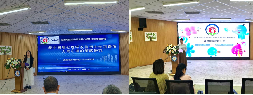 两项省级课题的主研教师严娟和邓燕林分别就《五育并举下促进初中生个性化发展的评价策略研究》与《基于积极心理学改善初中生习得性无助心理的策略研究》课题研究情况,系统汇报了阶段性的探索实践与成效,并坦诚提出了研究过程中的真实困惑,为后续精准研讨奠定基础。