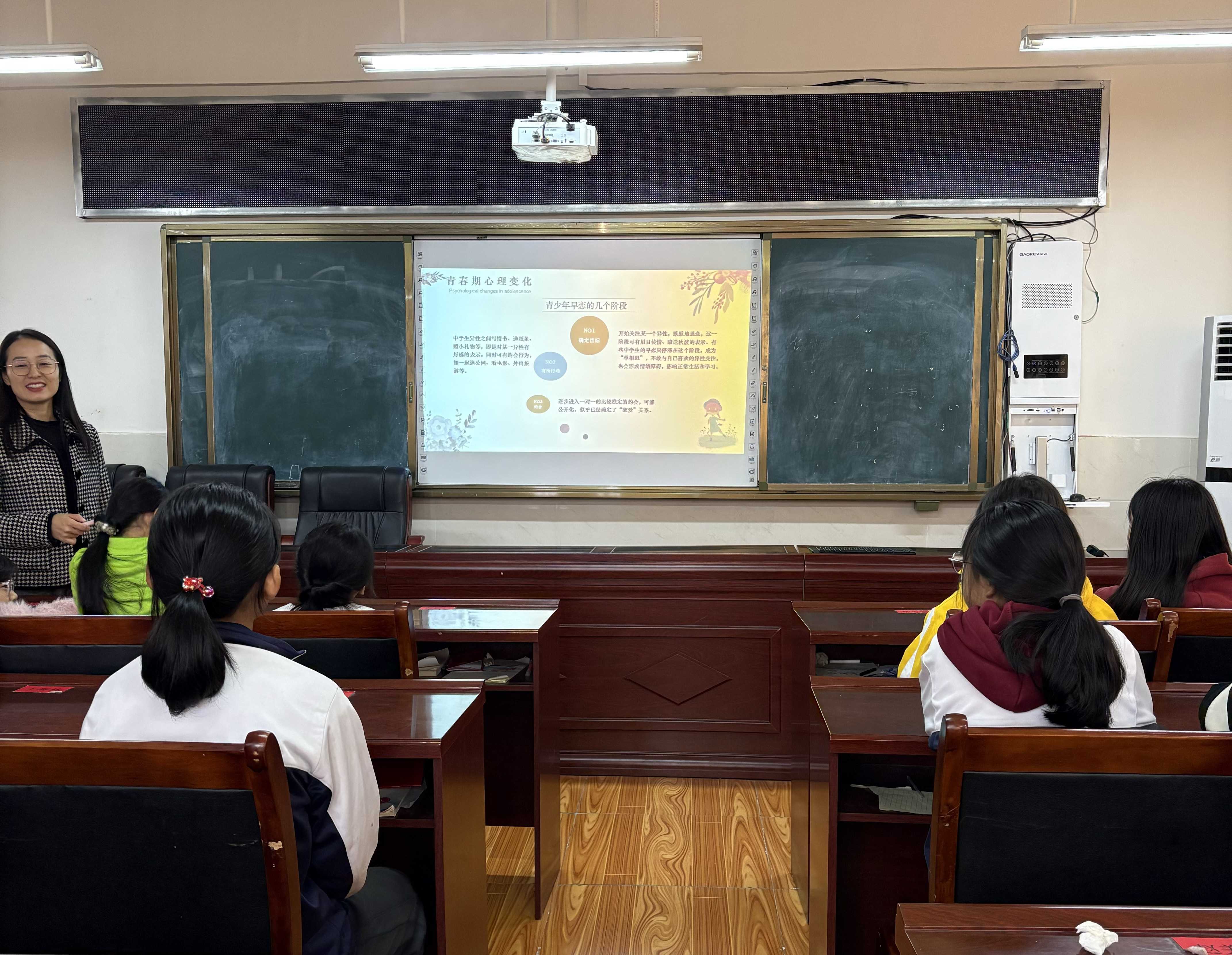 在青春期心理变化板块,陈老师重点聚焦情绪管理与情感认知两大方向。针对青春期女生易出现的情绪波动问题,她分享了简单可行的情绪调节方法;同时,结合真实案例客观分析“早恋”的影响,帮助女生建立正确的情感观,明确现阶段的成长重点。整个讲解过程中,陈老师注重与学生互动,通过“提问+倾听”的方式鼓励女生主动表达困惑,现场氛围轻松且专注。
