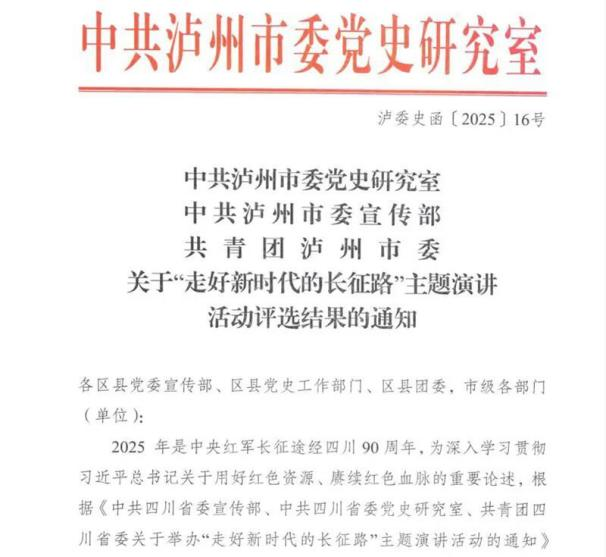 近日,中共泸州市委党史研究室、中共泸州市委宣传部、共青团泸州市委联合发布“走好新时代长征路”主题演讲活动评选结果。泸州老窖天府中学报送作品《渡桥传星火》凭借深刻的主题内涵与出色的呈现效果,从全市35部优秀作品中脱颖而出,斩获二等奖,将在“泸州史志”视频号上展播。