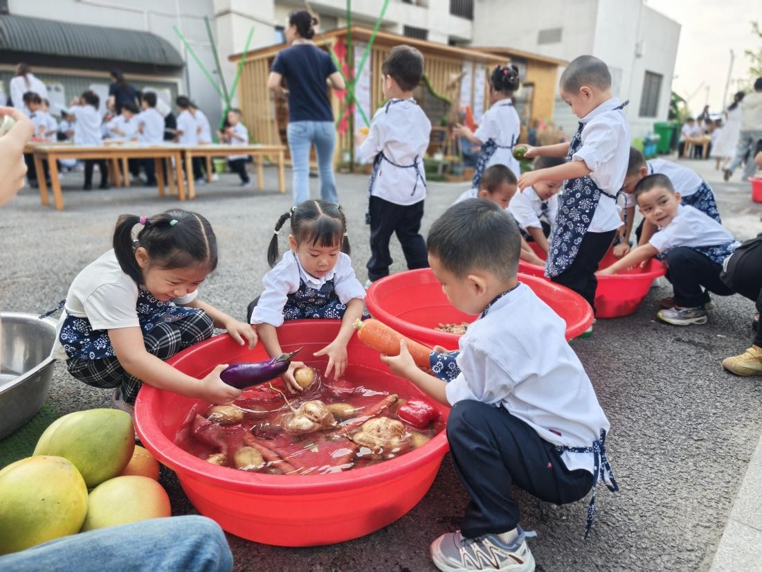 中班幼儿在南溪集市外解锁“晒秋小能手”新身份。在“清洗区”,幼儿搓洗玉米、红薯、萝卜、南瓜等果蔬,呈现出一派忙碌的情景;在“加工区”,教师及家长志愿者示范正确握刀手势,引导幼儿将南瓜、红薯、胡萝卜等切薄片;孩子们用簸箕筛去杂质,将果蔬分类摆入竹筛,为晾晒做准备。在“晾晒区”,孩子们认真地将果蔬穿成一串串成果挂上晾晒架。
