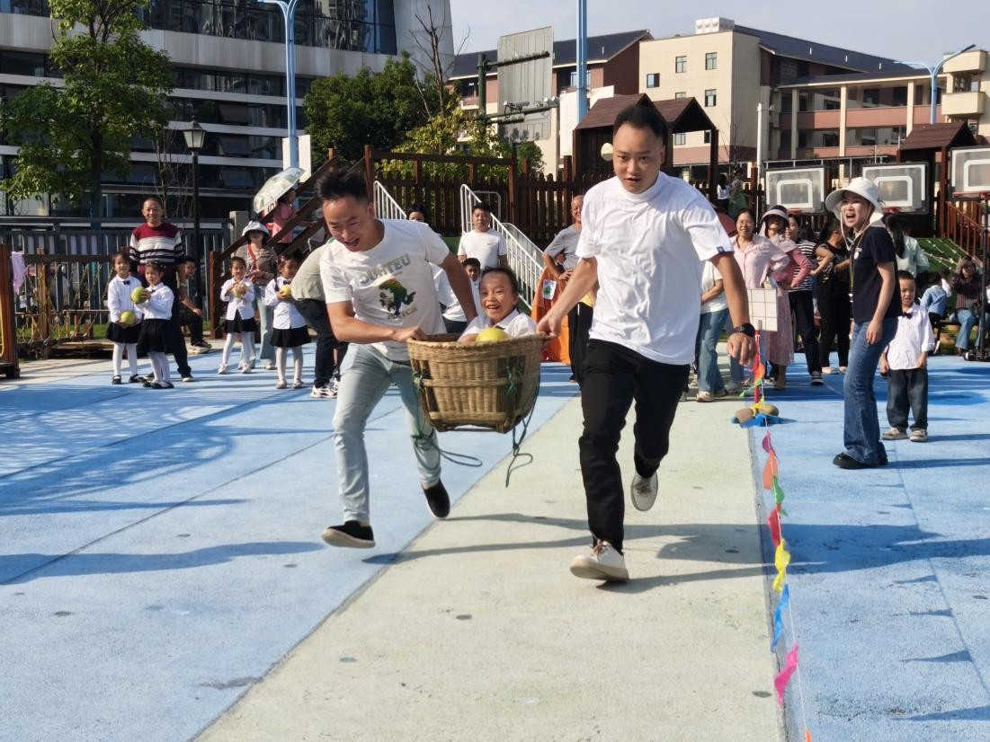 在活动“滚瓜烂熟”中,家长从起点滚南瓜至中线,幼儿接住南瓜运至终点桶,限时 3 分钟内以桶中南瓜数量计分;在活动“秋收美味圈”中,一组三名家长站在绳子中间,三名幼儿站在绳子外的圈内,计时开始后家长用力奔向幼儿,幼儿喂橘子给家长吃,最先吃完的小组获胜,再进行角色交换游戏;在“柚子接力赛”中,幼儿手持若干柚子坐在箩筐中,两名家长抬箩筐将幼儿安全输送到终点,返回起点再次输送幼儿到终点,在规定时间内输送柚子数量多的队伍获胜。