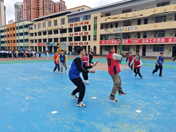 下午,罗校长为六年级(2)班与(7)班的揭幕战开球。赛场上,双方队员攻防有序、配合默契,精准投篮与顽强防守轮番上演。场边啦啦队呐喊助威、口号整齐,欢呼声此起彼伏,充分展现了校园体育的活力与班级凝聚力,完美诠释了团队协作的体育精神。