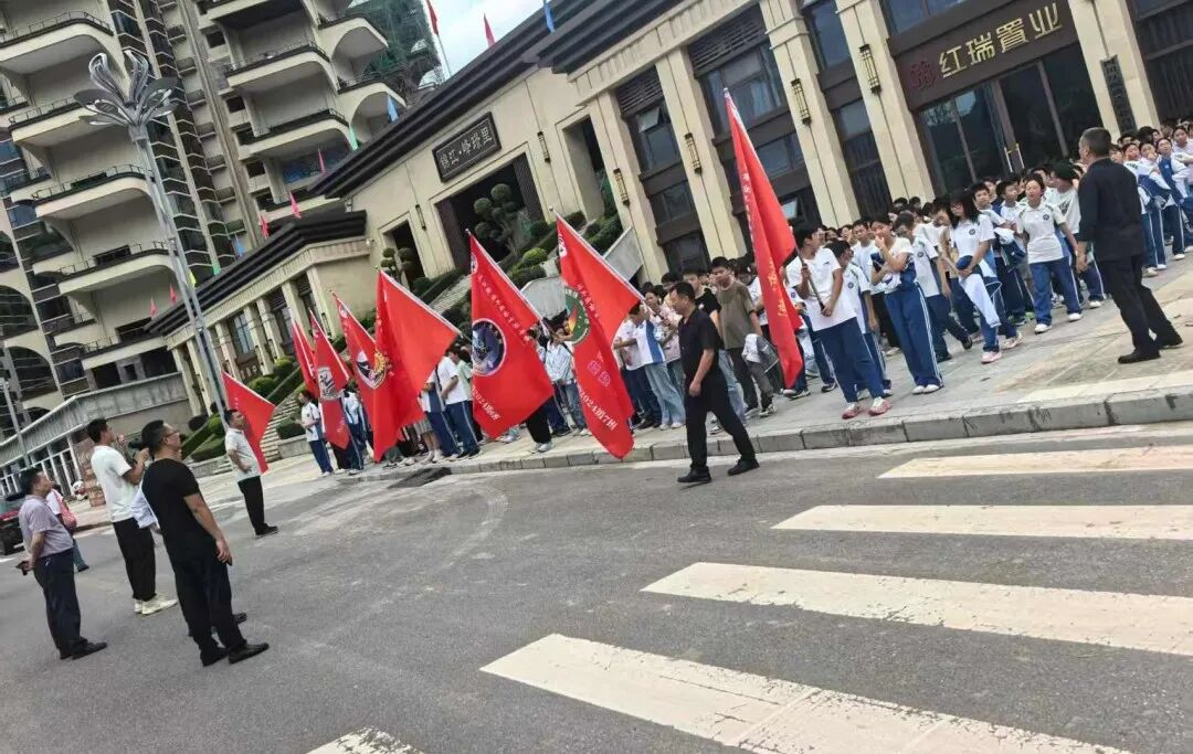 “看,那是我们班的旗帜!”沿途,各班设计制作的创意班旗迎风招展,成为一道亮丽风景。
