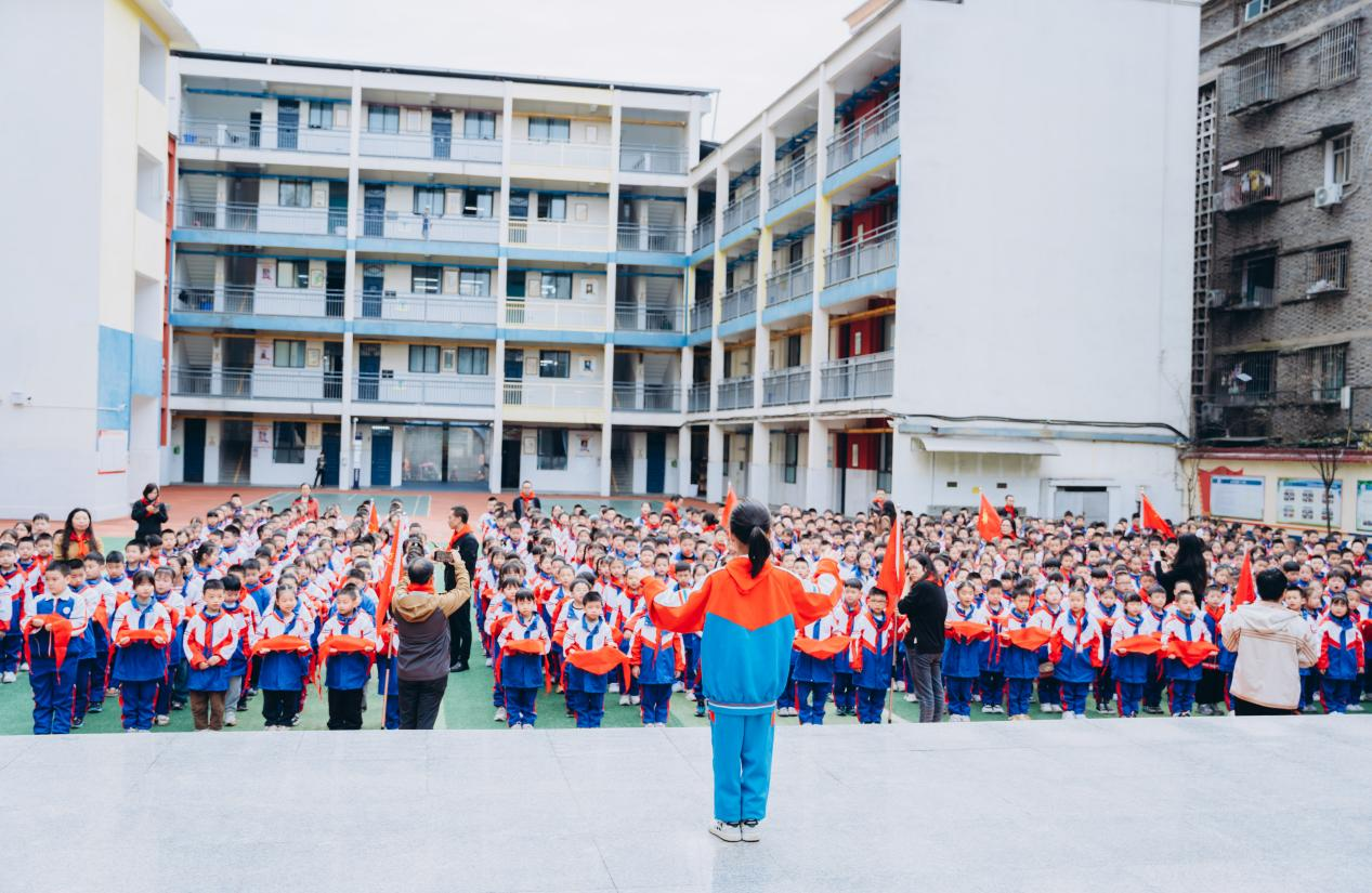 学校党委书记杨挺发表致辞。他将胸前的红领巾与厚重的革命历史紧密相连,深情地说道:“红领巾是红旗的一角,是革命先烈用鲜血染成的。希望你们系住的不仅是这抹红色,更是爱国情怀与文明之光,要用实实在在的行动,为它增添光彩。”杨书记语重心长地叮嘱孩子们,要永远铭记这份红色的责任与承诺,让革命精神在新一代身上延续。