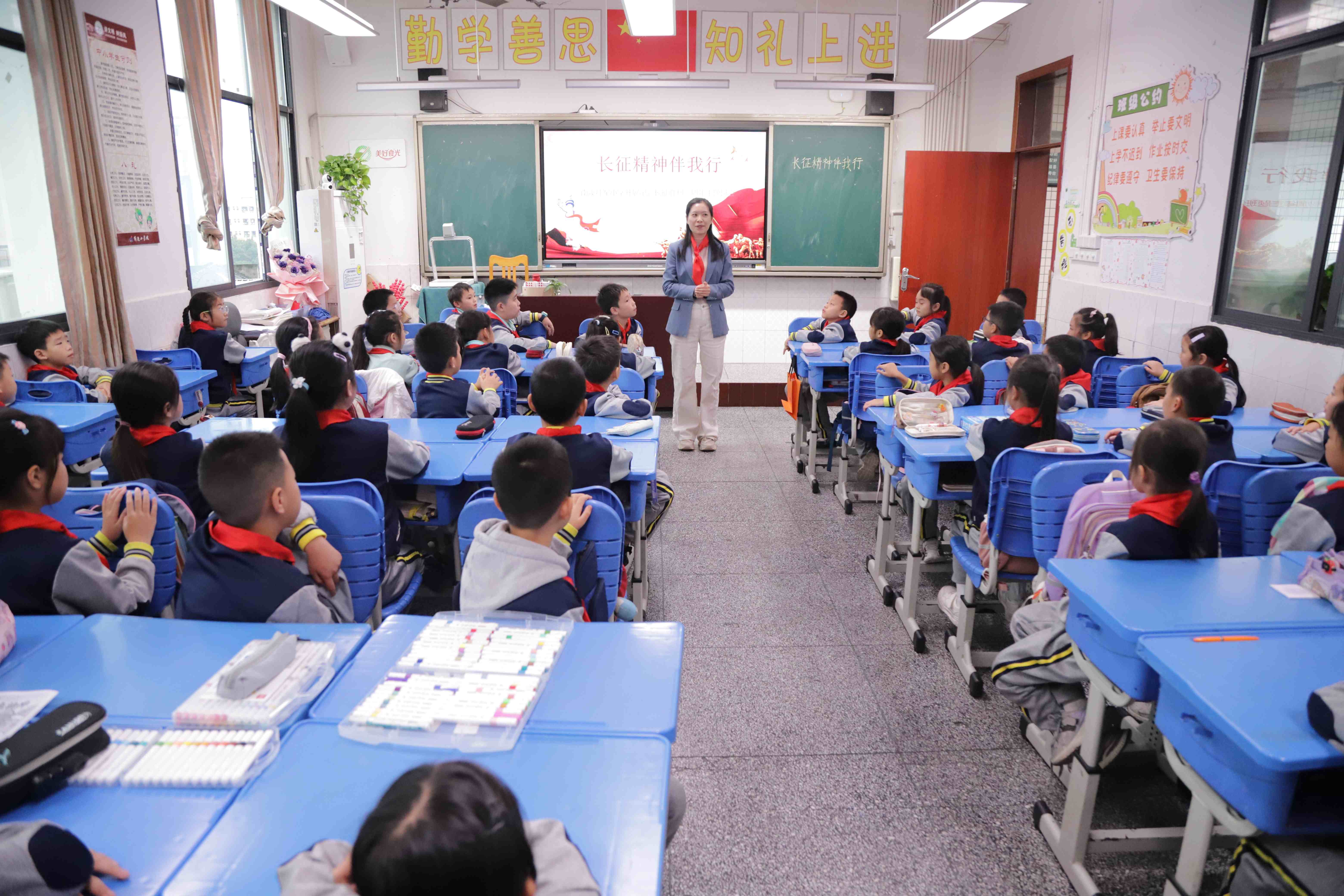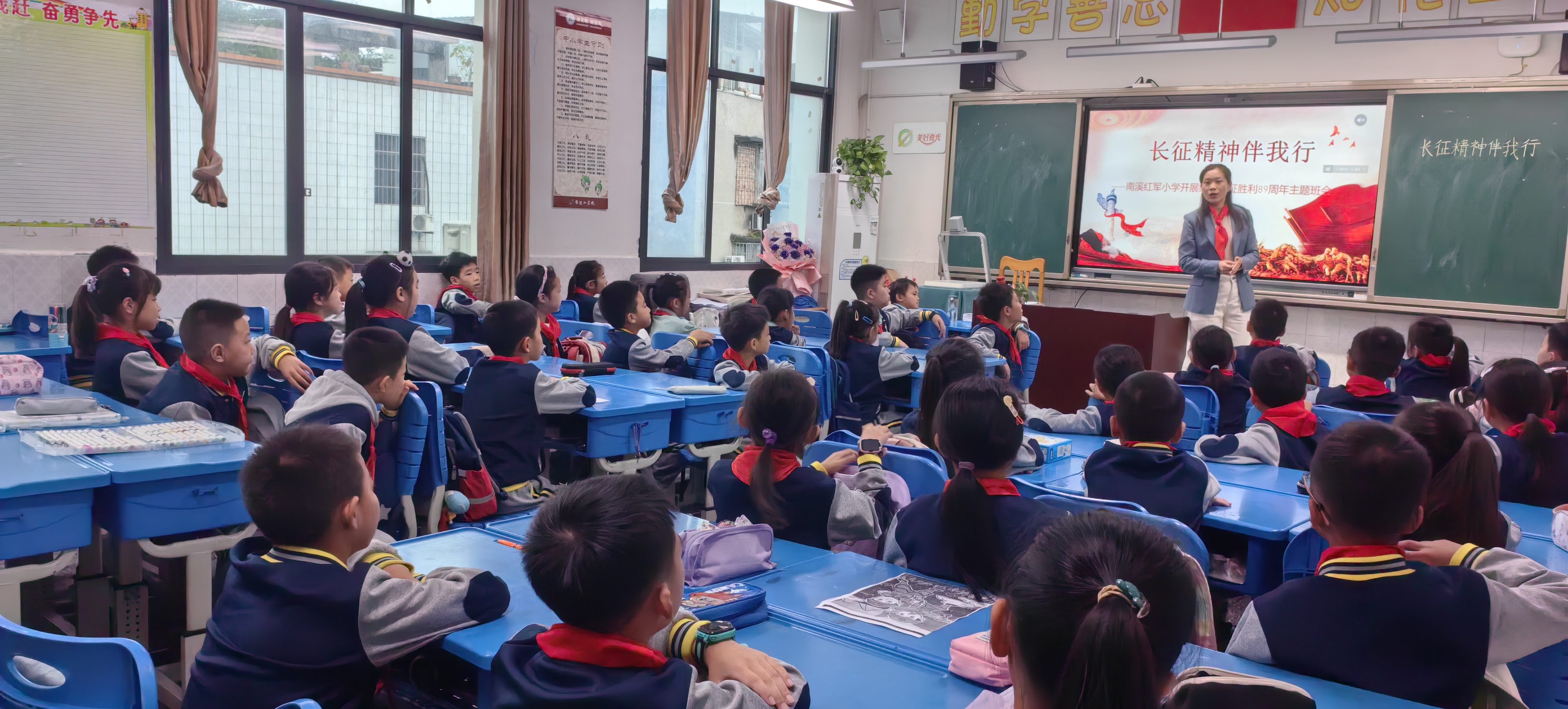 为传承红色基因,让长征精神在少年心中扎根,10月22日,南溪红军小学四(1)中队开展了“长征精神伴我行 红色基因润童心”纪念长征胜利89周年主题班会。班会以“知来路、感艰辛、学精神、践行动”为主线,通过沉浸式体验与互动交流,让队员们在轻松氛围中读懂长征故事,汲取精神力量。