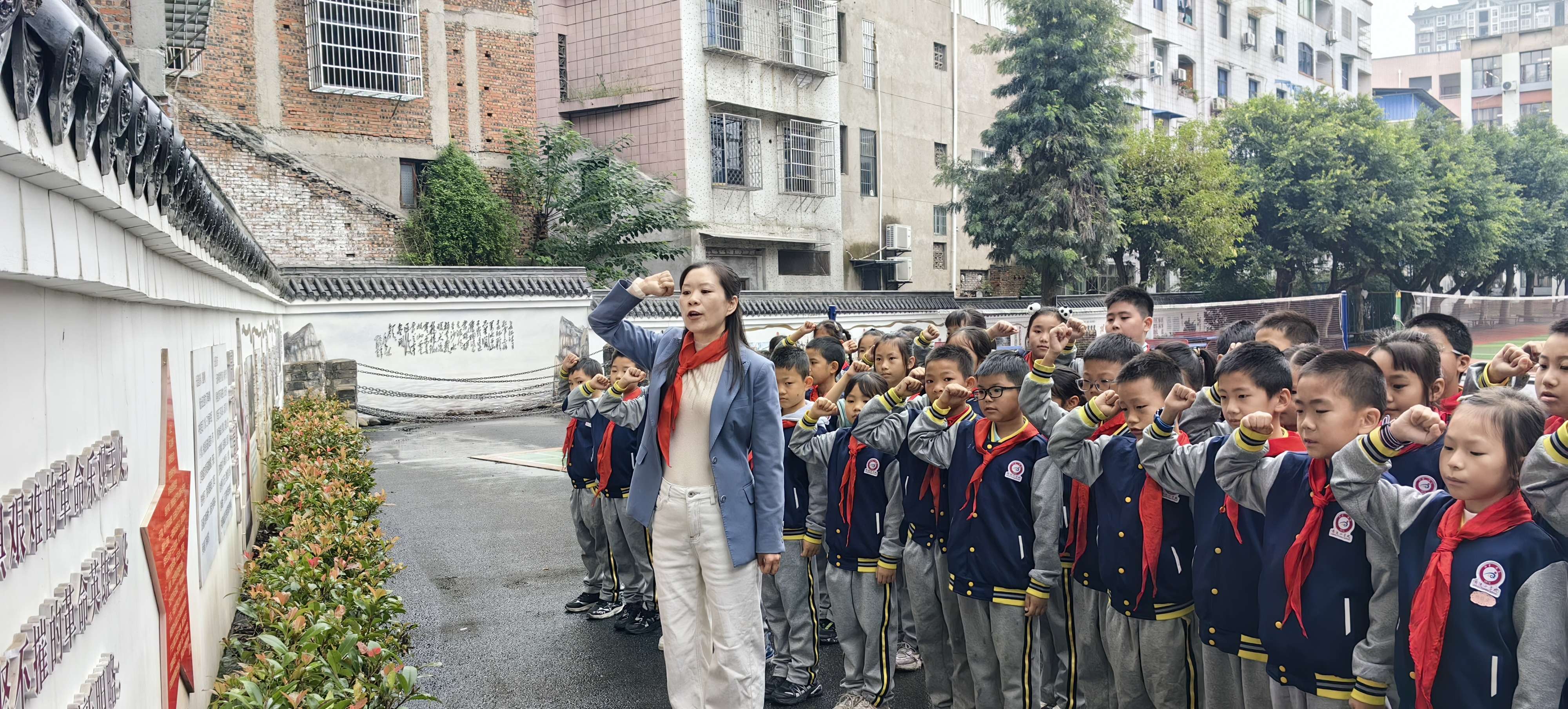 班会伊始,辅导员冷敏老师以“你听说过长征吗?”的提问快速引入主题,激发队员们的探究兴趣。随后,在“知来路”环节,两名小讲解员带领大家“探访”学校红军墙,用“保护家人、保卫家园”的通俗类比,结合“第五次反‘围剿’失利”的历史背景,让队员们明白红军长征出发的必要性,懂得今天的幸福生活来之不易。