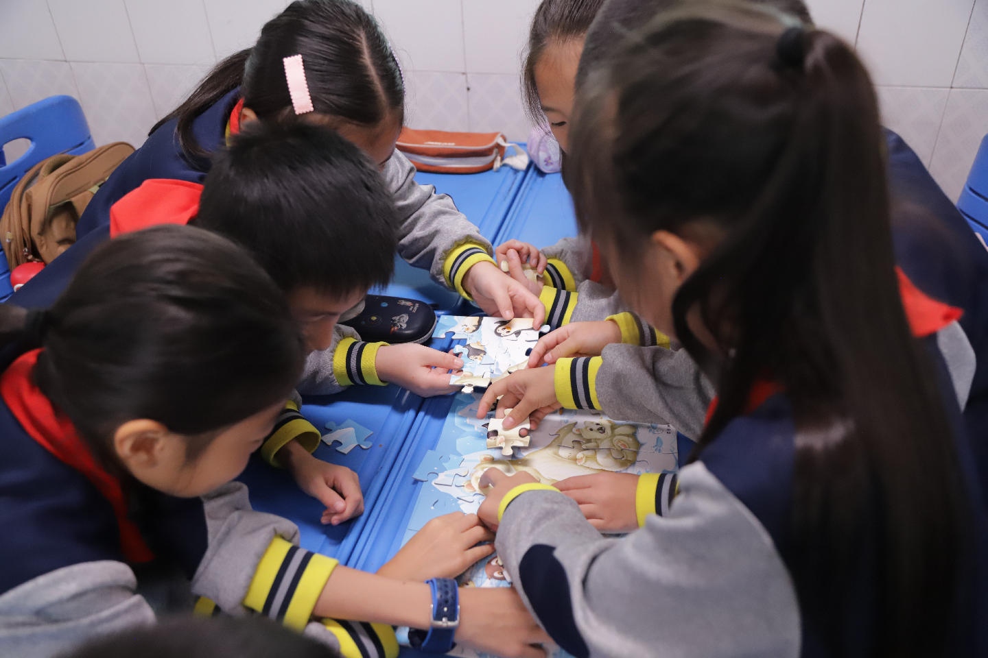 “感艰辛”环节中,队员们分组参与拼图、绘画、讲故事等活动。大家专注拼搭“爬雪山、过草地”场景拼图,细致描绘红军艰难行军画面,深情讲述《金色的鱼钩》《半袋干粮》等故事,直观感受红军在长征中面临的严寒、饥饿与危险,深刻体会“不怕苦、不放弃”的精神内涵。