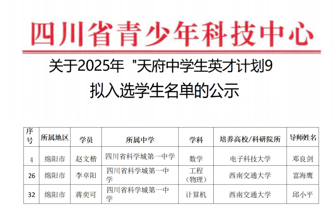 继2025年9月,四川省科学城一中高一年级唐鑫鑫同学作为绵阳市仅有的3名入选者之一成功入选四川省中学生英才计划之后,近日,2025年“天府英才计划”拟入选名单正式发布,科学城一中又有三位学子凭借卓越实力脱颖而出,一举包揽绵阳市所有入选名额,充分彰显了四川省科学城一中在拔尖创新人才培养上的硬核实力!