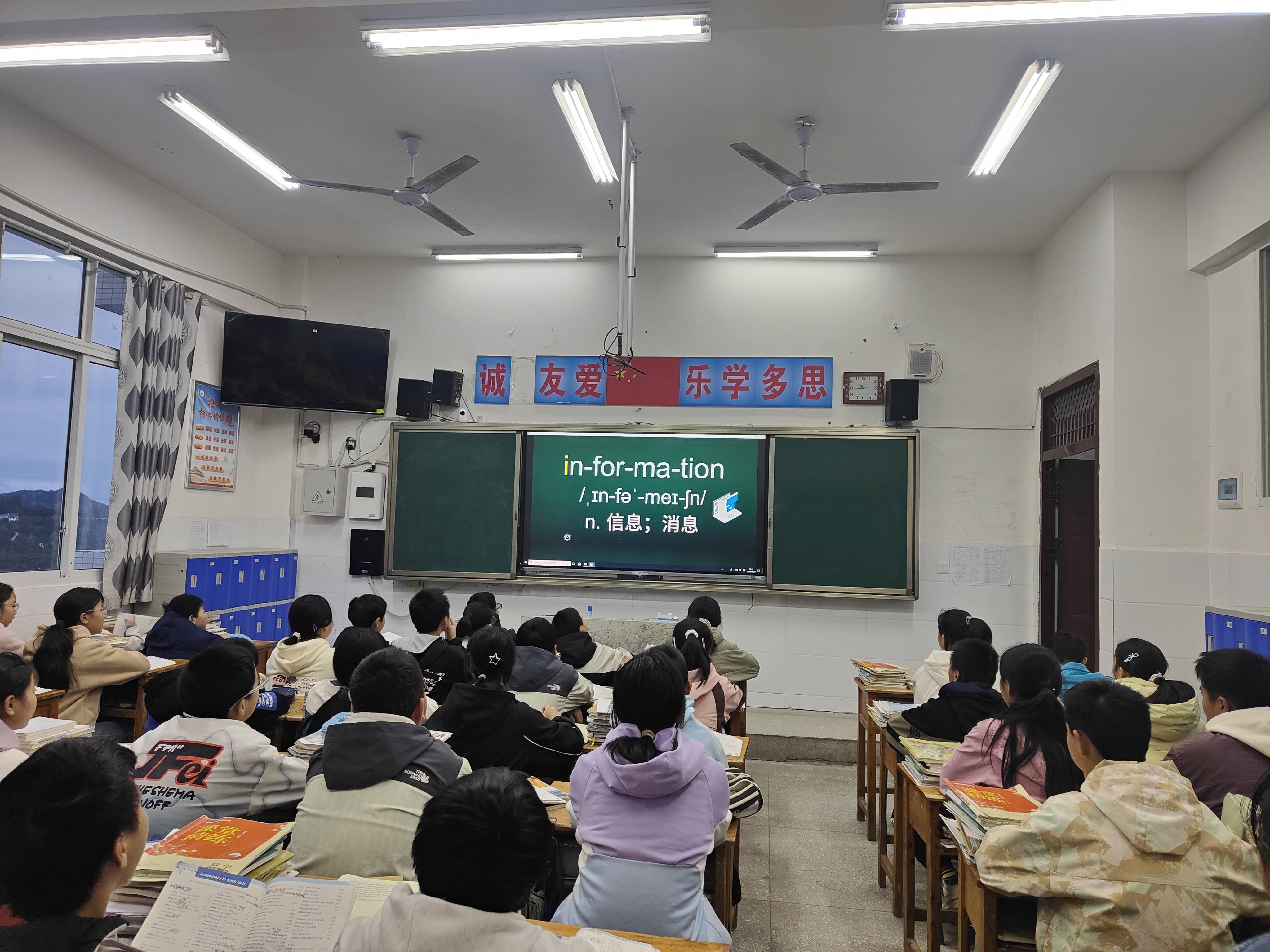 初到学校,孙雪英便主动扛起教学重担,每周承担12节英语课。面对乡村孩子普遍存在的英语表达困境加上英语基础薄弱问题,她为提升学生的发音、词汇记忆与课堂参与度,引入了AI助教(豆包)与多款数字课堂工具,形成“四步法”教学模式:音节划分—跟读训练—游戏巩固—智能出题,通过每周两节课一个学期为一个周期,每次约15分钟用于数字课堂环节,其余时间则结合传统教学方法,围绕七上教材单元主题展开。同时,她借助班级小管家的录音功能,让学生逐句跟读单词与课文中需要背诵段落,并可实时听到自己与标准发音的对比。孙老师表示,后期她还将采用单词消消乐的游戏来巩固学生基础。