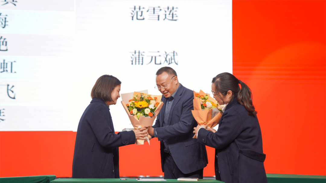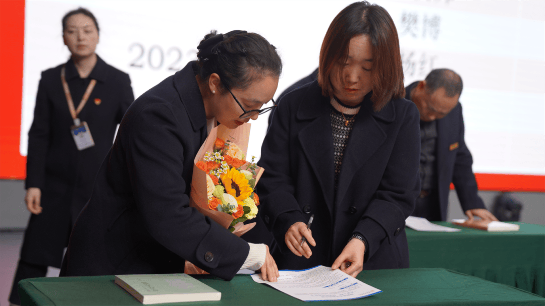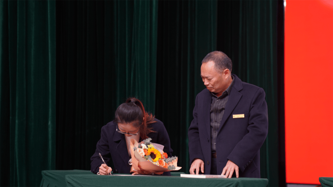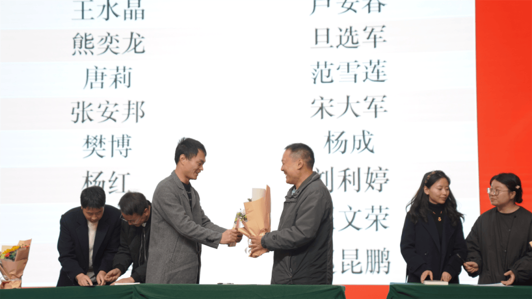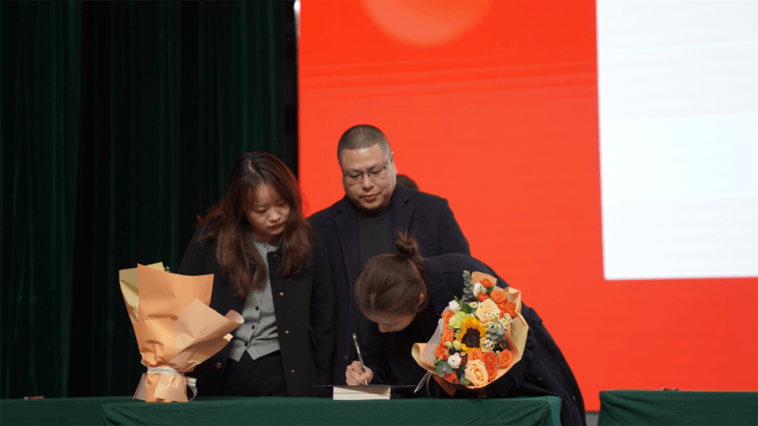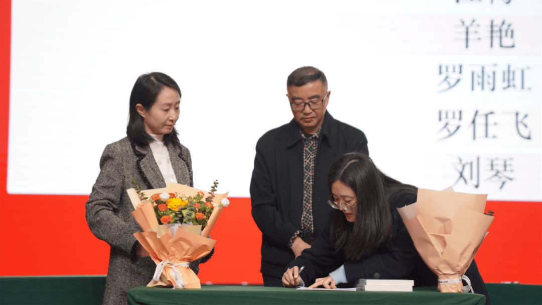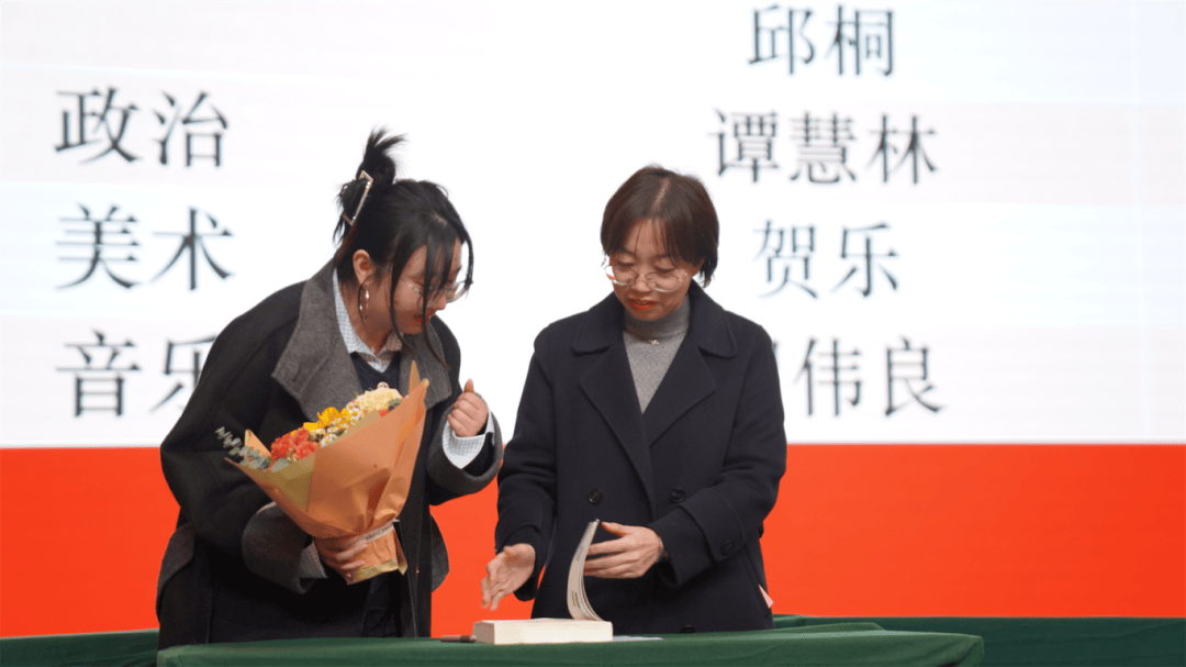 全体导师与学徒教师依次登台,郑重签下《师徒结对承诺书》。聘书为证,承诺为凭;鲜花敬师,书籍传情。学徒们为导师献上鲜花,以表对师道的尊崇与求学的诚心;导师们为学徒赠书,传递从教经验,寄托殷切期望。