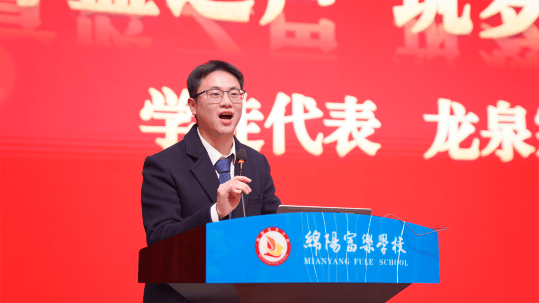 “青蓝工程”学徒代表龙泉霖老师上台发言。他表达了对学部搭建成长平台的感激、对导师悉心指导的期盼,同时表示一定会怀揣着空杯心态、虚心求教,以锐意进取的决心、秉持学部"一群人,一条心,一起拼,一定赢"的信念,早日成为富高教育教学的中坚力量。