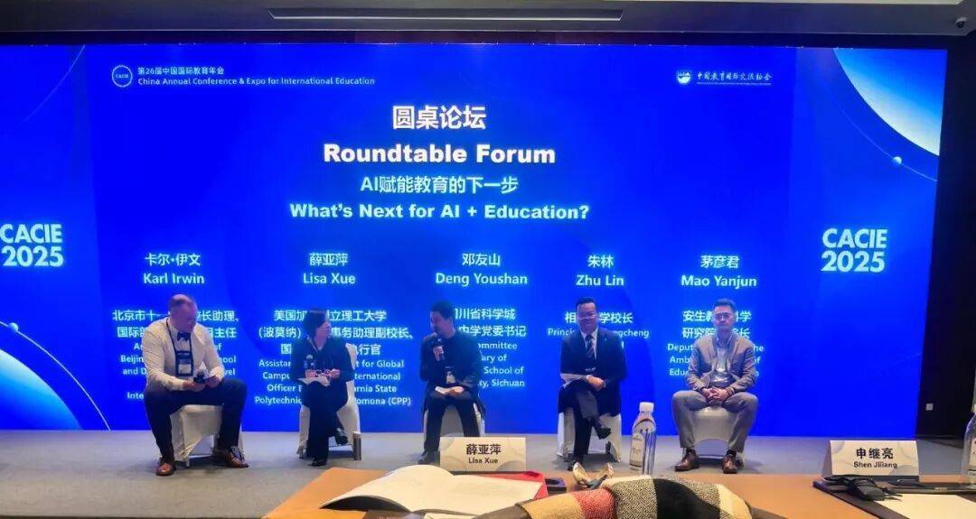10月31日下午,四川省名校长工作室领衔人、科学城一中党委书记邓友山应邀出席年会中学教育国际研讨会圆桌论坛并发言。值得一提的是,四川省受邀的嘉宾仅有成都七中和科学城一中的代表。本次圆桌论坛以 “AI 赋能教育的下一步” 为主题,受邀嘉宾包括美国加州州立理工大学全球教育交流学院主任 Lisa Xue、江苏省苏州市相城中学校长朱林和安生教育科学研究院副院长茅彦君等。
