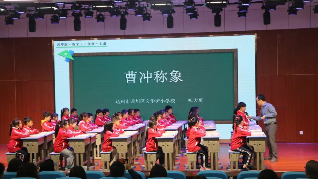 名师示范课环节中,郑大军老师执教《曹冲称象》,通过情境创设引导学生从历史故事中理解数学原理,激发学生的逻辑思维与解决问题能力。