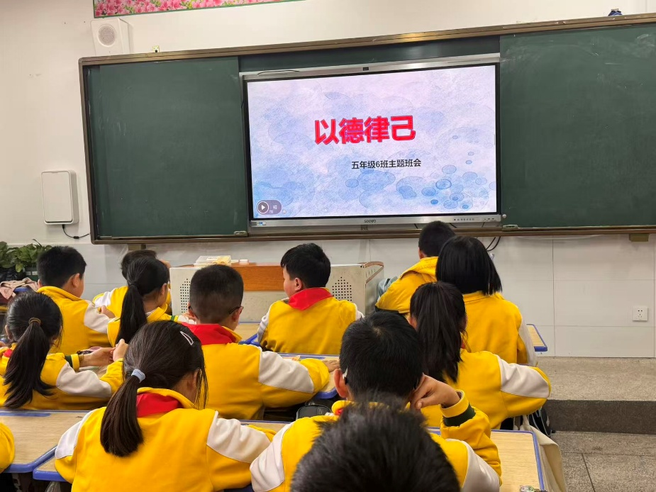 在五年级6班的教室里,一场以“以德律己”为主题的班会正在进行。同学们身着统一的黄色校服,整齐地坐在课桌前,目光聚焦在前方的多媒体屏幕上。屏幕上“以德律己”四个鲜红的大字格外醒目,老师围绕品德修养、自我约束等内容,通过案例分析、小组讨论等形式,引导学生们明白要从自身做起,用道德准则规范言行,做一名品德高尚的新时代少年。
