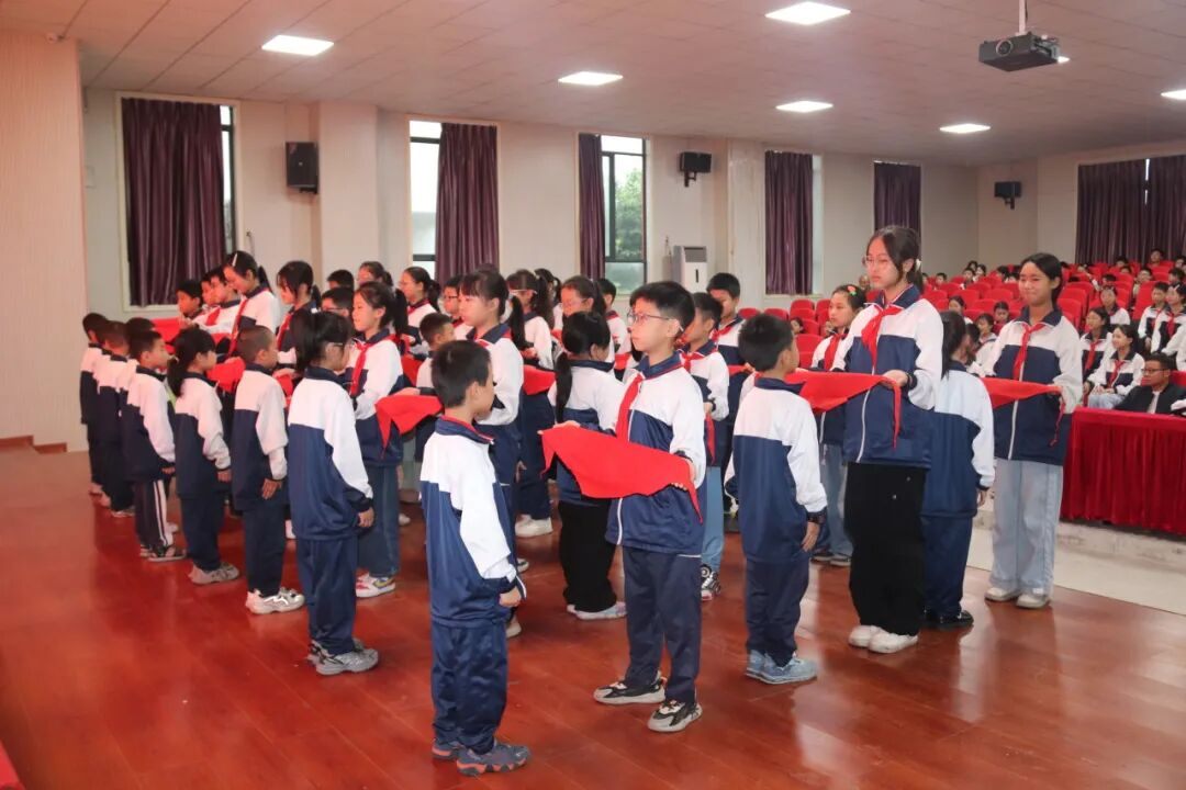 随后,高年级的少先队员们迈着整齐的步伐,为新队员们郑重系上鲜艳的红领巾。当三角红绸在胸前展开,孩子们的眼神里满是好奇与向往,小脸渐渐露出自豪的笑容。