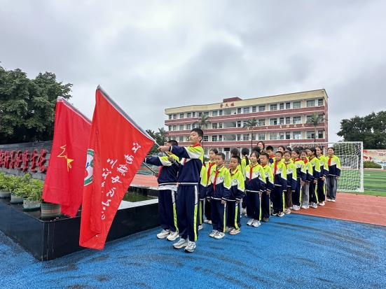 10 月 29 日下午 13:50,参与活动的师生在学校旗台前整齐集合。同学们统一穿戴整洁、佩戴红领巾,在老师的引导下,保持安静有序的队列步行前往敬老院,展现出江南中心校学生良好的行为素养。