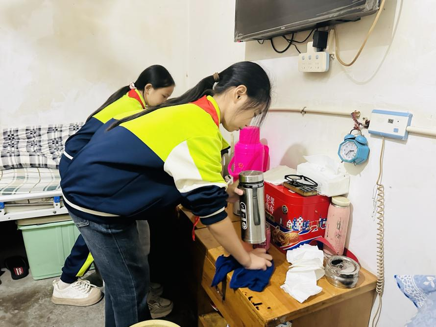 表演结束后,师生们分组走近老人。每两名同学搀扶一位老人返回房间,拿起扫帚、抹布认真打扫房间卫生,将桌面、窗台擦拭干净。随后,在陪老人聊天环节中,同学们耐心聆听老人讲述过去的生活故事,时而点头回应,时而分享自己在学校的学习与趣事,还主动为老人捶背揉肩。温暖的互动中,老人们的眼角满是笑意,不少老人拉着同学的手不舍松开。