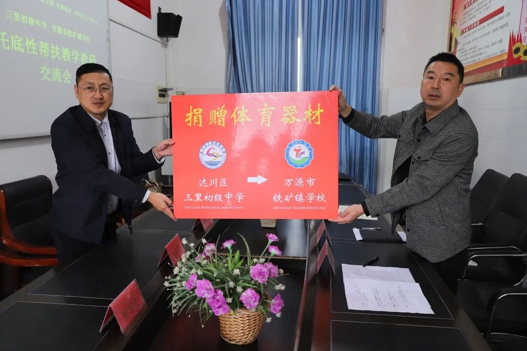 在教研交流活动中,三里初中党总支书记余刚重点分享了校本教研机制与教师专业发展路径的经验,为铁矿镇学校教研教改工作提出了建议。副校长童海玲代表学校捐赠部分体育器材。