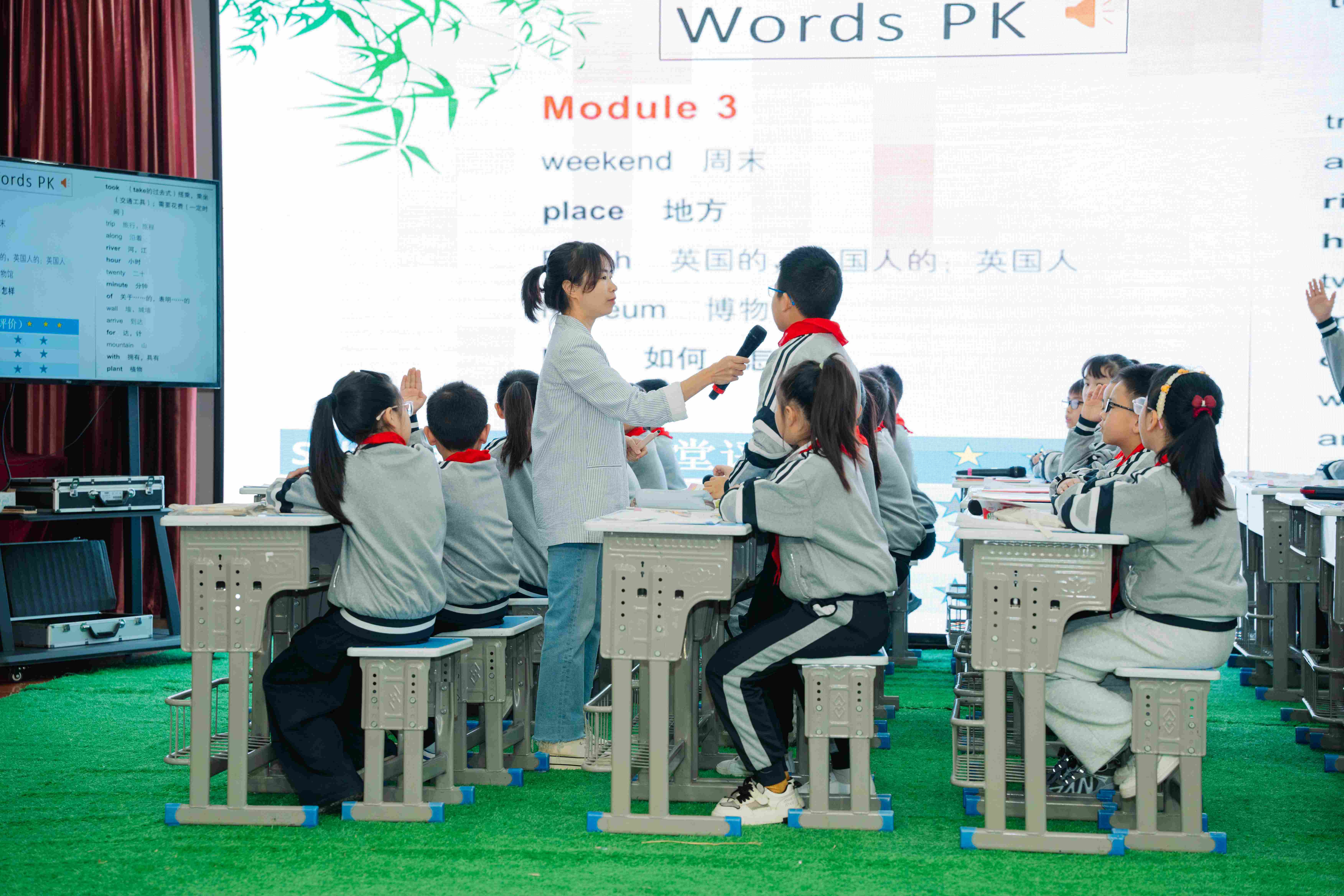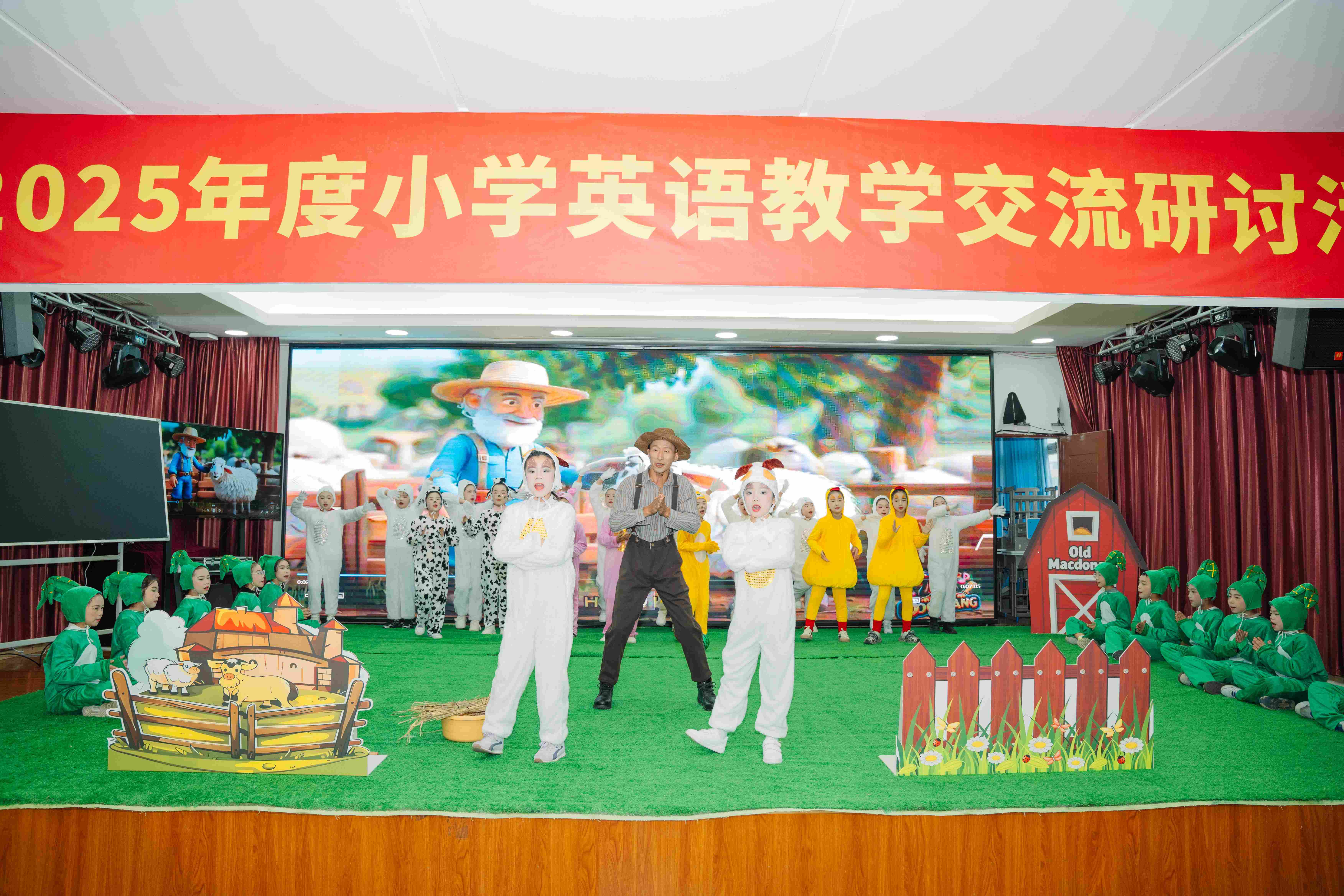 活动伊始,三小师生带来的情景剧《Old MacDonald》如同一束璀璨的烟火,瞬间点燃了现场的氛围。董恒老师化身幽默风趣的农场主,带领四年级的小朋友们分别扮演小鸡、小鸭、小牛等可爱的动物角色。孩子们身着精心准备的道具服饰,在欢快的旋律中唱跳互动,生动地还原了农场里的欢乐场景。他们标准的英语发音、灵动的肢体语言,不仅展现了扎实的英语基础,更让在场教师深刻感受到情境教学与歌曲融合的独特魅力,仿佛置身于一个充满童趣与活力的英语世界。