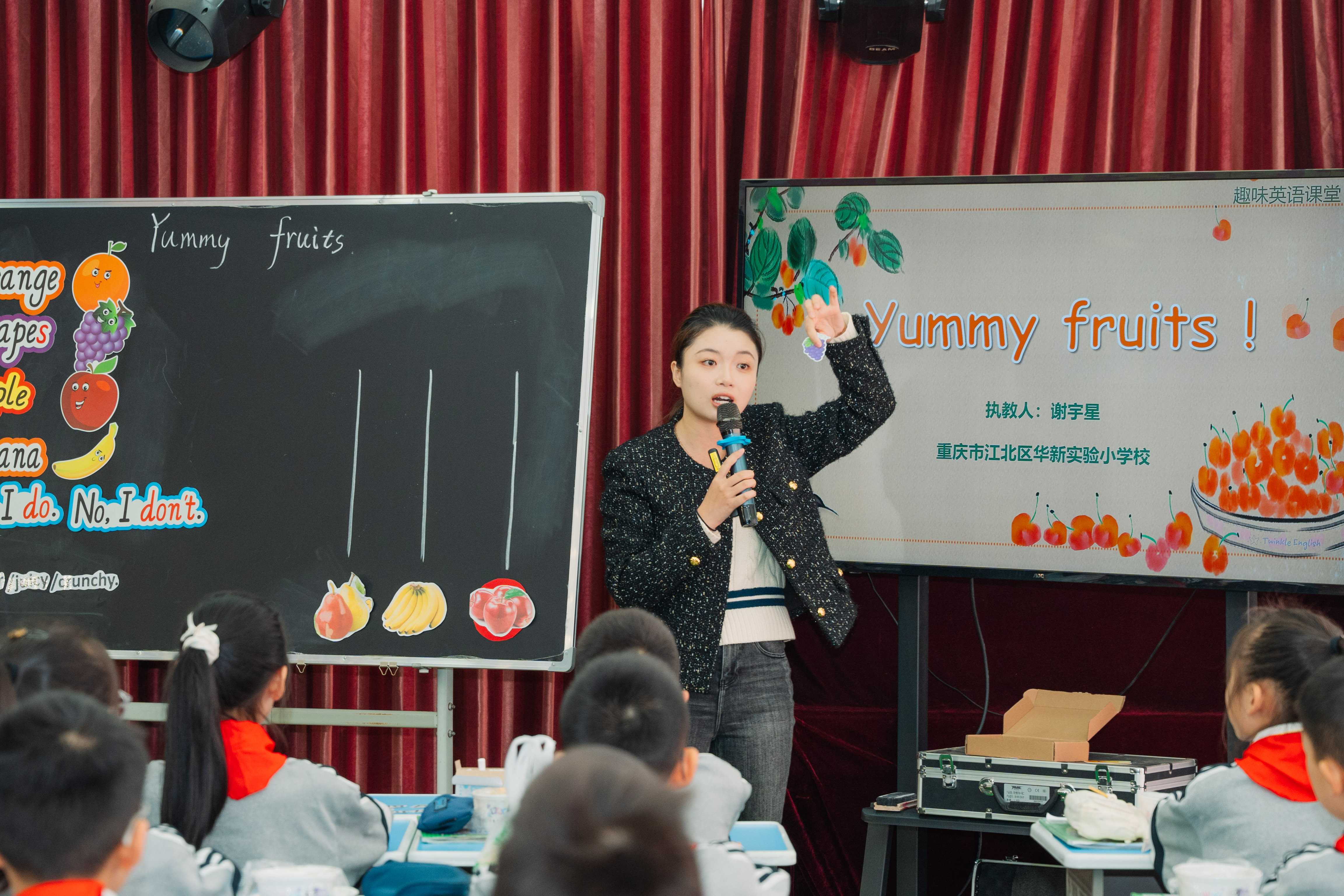 重庆市江北区华新实验小学校英语骨干教师谢宇星老师带来的《Yummy Fruits》,则让果香伴四季,“英”彩润课堂。课堂以“旅行爱好”巧妙切入,借白帝城实景图引出重庆奉节脐橙,延伸出navel orange、blood orange等品种,让学生在品尝中自然运用“Do you like oranges?”进行互动。随后,以四季为脉络,依次呈现新疆夏季葡萄、云南秋季丑苹果、海南冬季红香蕉,每类水果均关联产地特色,引导学生用“They’re sweet/crunchy”描述口感。课堂环节层层递进,单词认读夯实基础,chant创编活跃氛围,猜谜匹配深化认知。尾声的小组水果沙拉活动,更是让学生在协作中活用句型、交流口味,将“尝、说、做”融于一体。整堂课将实物观察、句型练习与小组协作深度融合,让英语学习跳出课本束缚,变得可看、可尝、可参与,既传递了四季风物之美,又落实了英语表达技能,为全县英语教师呈现了一堂鲜活且扎实的示范课程。
