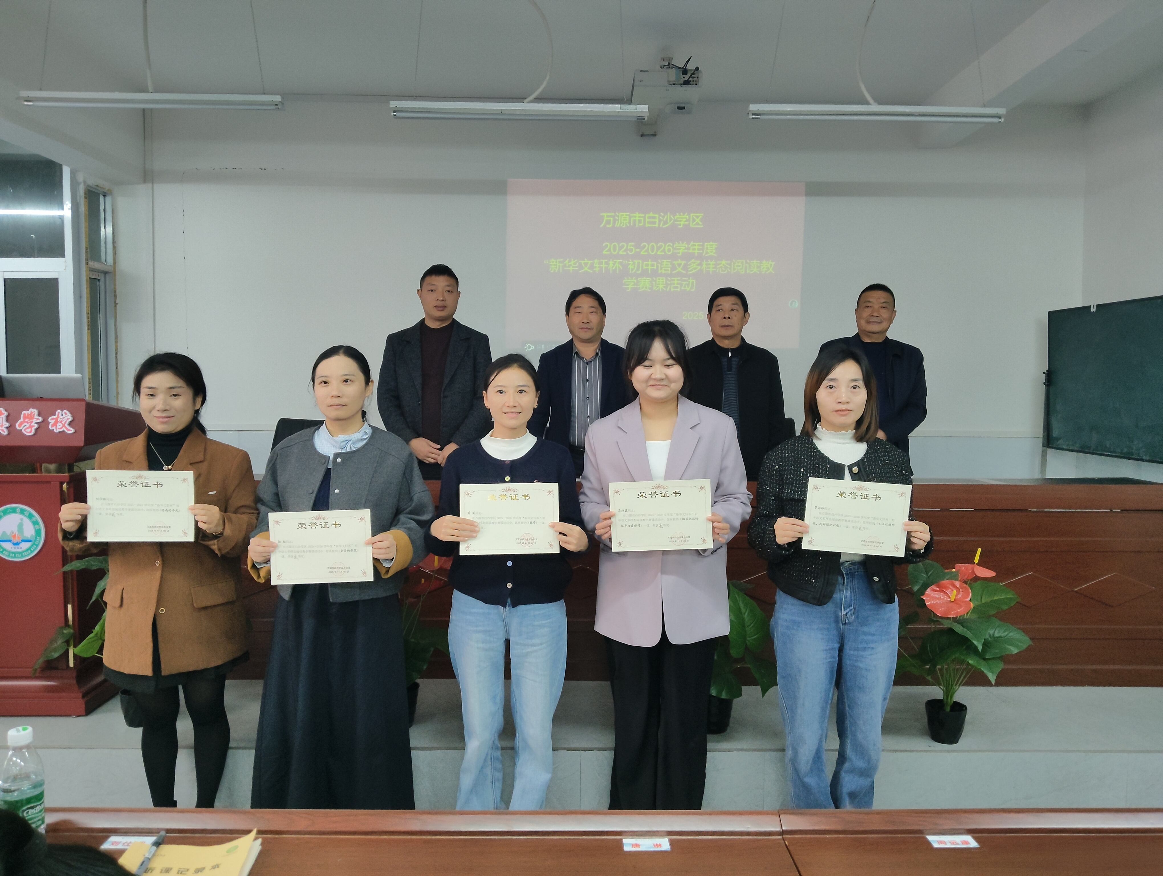 第二阶段现场授课评比。晋级的 2 名教师走进真实课堂,面对学生开展完整的阅读教学授课。课堂上,教师们充分发挥自身教学特色,或引导学生深入文本细节,感受语言文字的魅力;或组织小组合作探究,激发学生的思维活力;或借助多媒体教学手段,丰富课堂教学形式,营造出生动有趣、互动性强的教学氛围。学生们积极参与课堂互动,主动思考、踊跃发言,展现出良好的学习状态。授课结束后,评委组依据教师的教学目标达成度、教学方法运用、课堂氛围营造及学生学习效果等多个维度进行综合评分, 石塘学校教师苟英获得现场授课第一名。该教师将代表白沙学区参加后续的市级初中语文赛课活动。为开阔教师眼界,提升初中语文教学质量,促进教师专业发展,搭建教师交流学习、展示风采的平台,11 月 5 日,白沙学区2025—2026学年度 “新华文轩杯” 初中语文赛课活动在八台镇学校举行。白沙学区及所有参赛教师参加了此次活动。