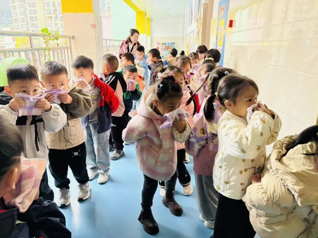 为检验应急预案的实用性和可操作性,幼儿园组织了全园消防安全应急疏散演练。警报响起后,全体教职工立即启动应急响应。在老师的带领下,孩子们用湿毛巾捂住口鼻,弯腰低姿,紧张而有序地按照预定路线撤离到安全区域。整个过程迅速、规范,达到了预期效果,有效提升了师幼的应急反应和协同配合能力。