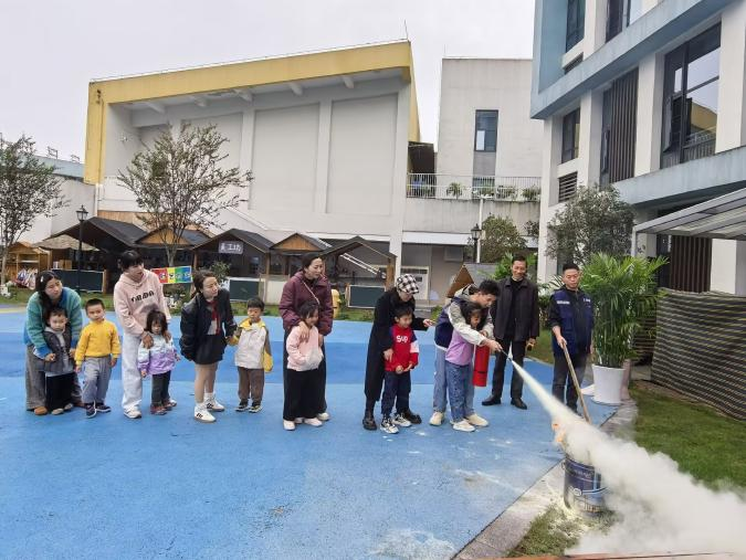 在灭火器实操环节中,老师和孩子们积极参与、亲身体验,通过“一提、二拔、三握、四压”的口诀,在实践中加深了对消防知识的理解与运用。