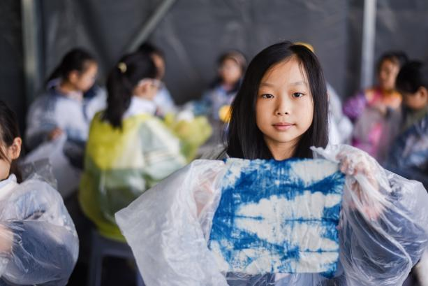 非遗文化体验环节堪称视觉与心灵的双重盛宴。在苎麻扎染非遗传承人的悉心指导下,孩子们发挥创意折叠、捆扎白布,再浸入靛蓝染料中。当布料缓缓取出,独一无二的蓝白花纹惊艳绽放,每一件作品都凝聚着创意与汗水,让孩子们在动手实践中读懂传统文化的匠心与魅力。