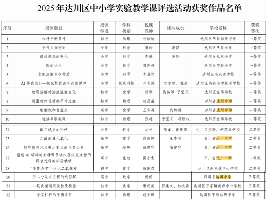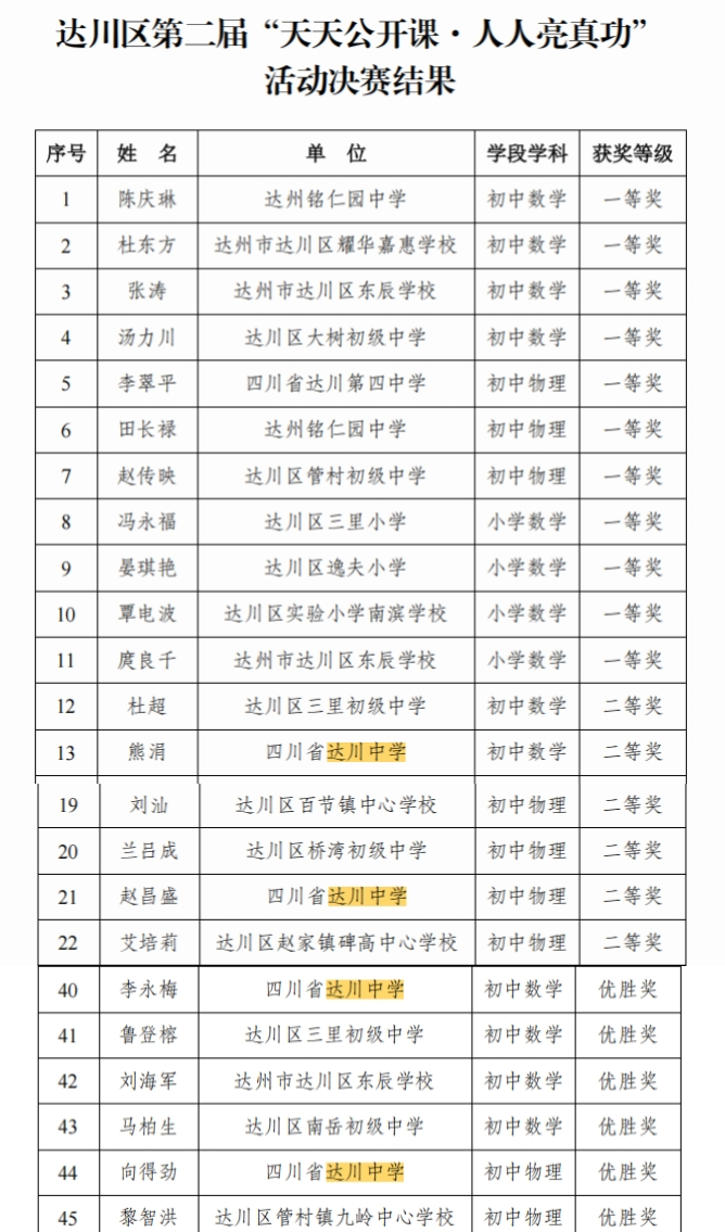 祝贺以上获奖教师!希望全体川中教师以他们为榜样,潜心教研,锐意进取,不断提升育人水平。学校将继续为教师成长搭建更加广阔的平台,共同推动学校教育教学质量再上新台阶,再创新辉煌!(四川省达川中学 杨丹)
