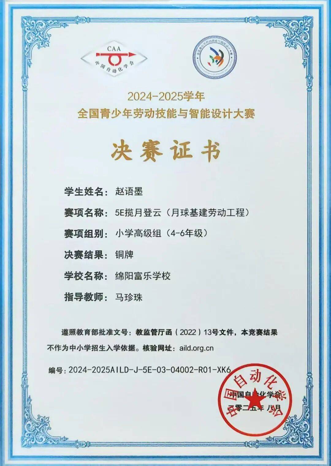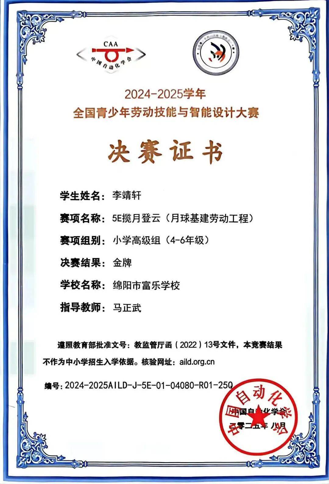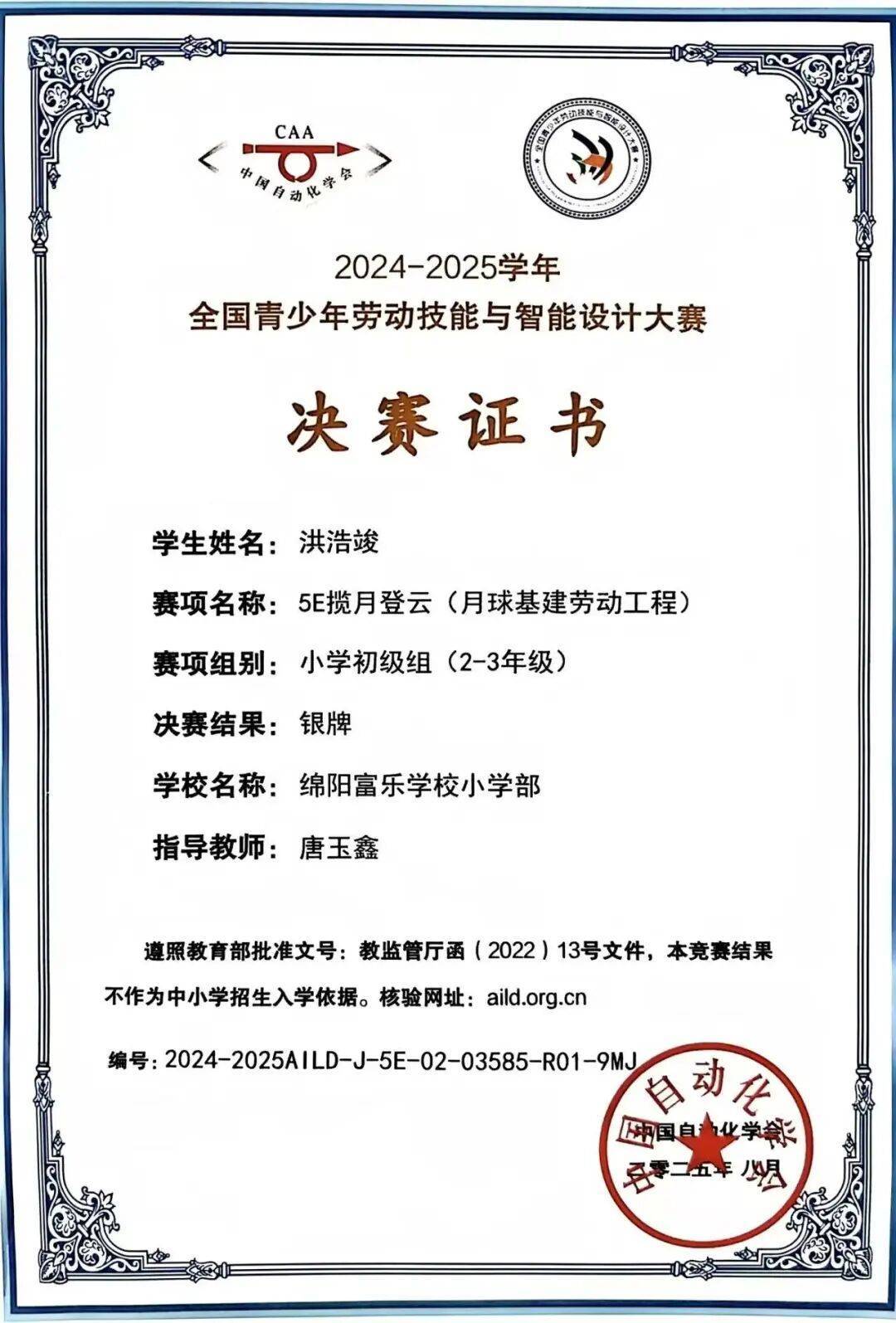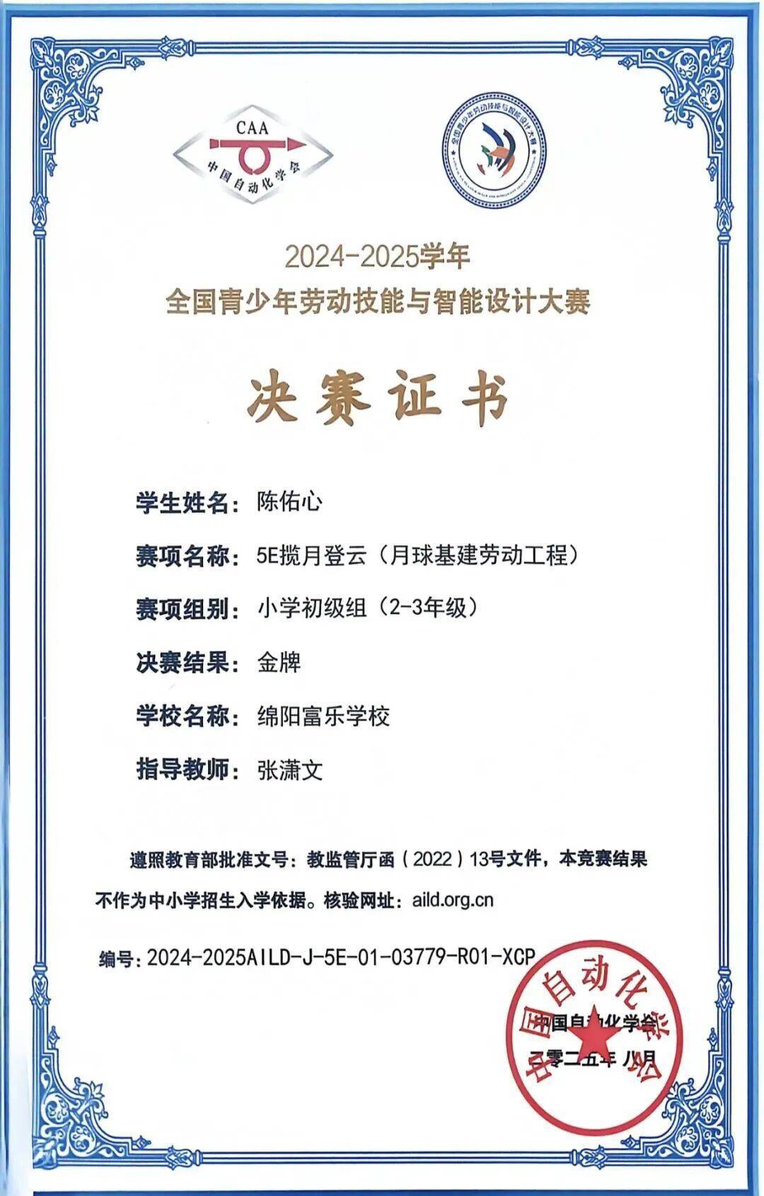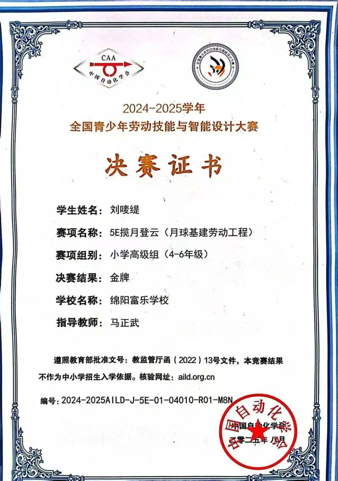 绵阳富乐学校小学部5名少年在山西怀仁举行的2024-2025学年全国青少年劳动技能与智能设计大赛总决赛上,直接捧回三金一银一铜!沉甸甸的奖牌闪耀赛场,不仅是孩子们的高光时刻,更藏着咱们学校创新教育的 “独家秘籍”—— 今天就带大家扒一扒,这些好成绩到底是怎么 “炼” 成的!