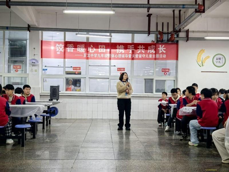 暮秋的余温尚未散尽,立冬的诗意已悄然降临。11月11日下午,宜宾三江新区罗龙初级中学校食堂内暖意融融,笑语盈盈,九年级全体学子齐聚于此,一场以“饺香暖心田,携手共成长”为主题的团体心理辅导暨关爱留守儿童活动温馨启幕。