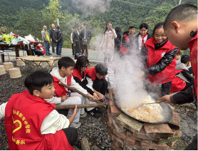 正午时分,黄金坝露营基地的野火饭制作体验将课程推向一个充满欢声笑语的高潮。秋日天干物燥,正是进行户外安全用火教育的绝佳时机。学生们分组协作,在学习野火饭历史文化背景、认识秋季当地时令食材的基础上,亲手搭建灶台、学习控制火候,共同烹饪一锅充满秋日风味的野火饭。在炊烟袅袅与饭菜香气中,他们收获的不仅是劳动技能,更是对秋日丰收与团队协作的切身体验。