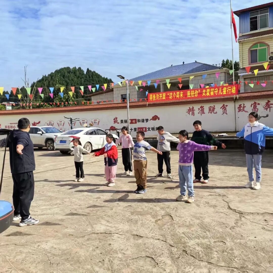 玉峰初中邀请得鱼沟村的孩子到校参与周末假日寄宿托管主题活动,在游戏中学习未成年人保护法知识,并派出教师志愿者到得鱼沟村深度走访慰问留守儿童。